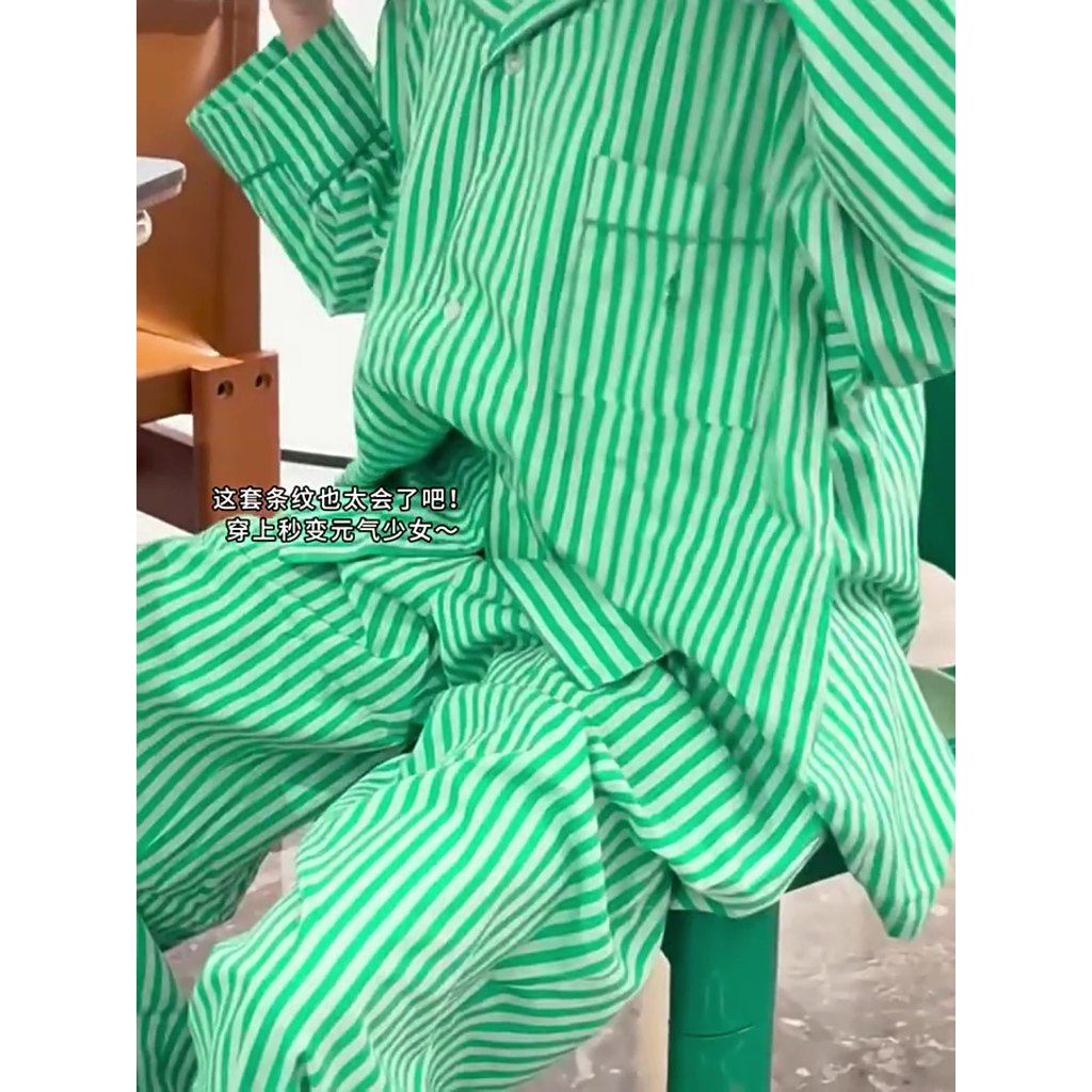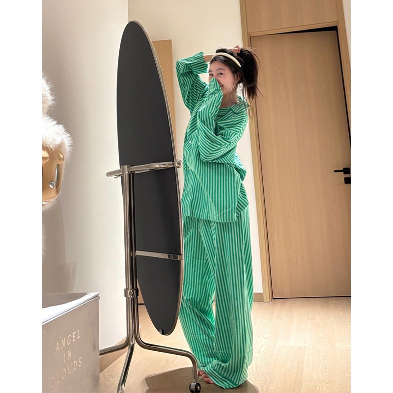 [TPNY]ชุดนอนแขนยาวลายทางสีเขียวสไตล์เกาหลีสำหรับผู้หญิง สไตล์ฤดูใบไม้ผลิและฤดูใบไม้ร่วง ปี 2026