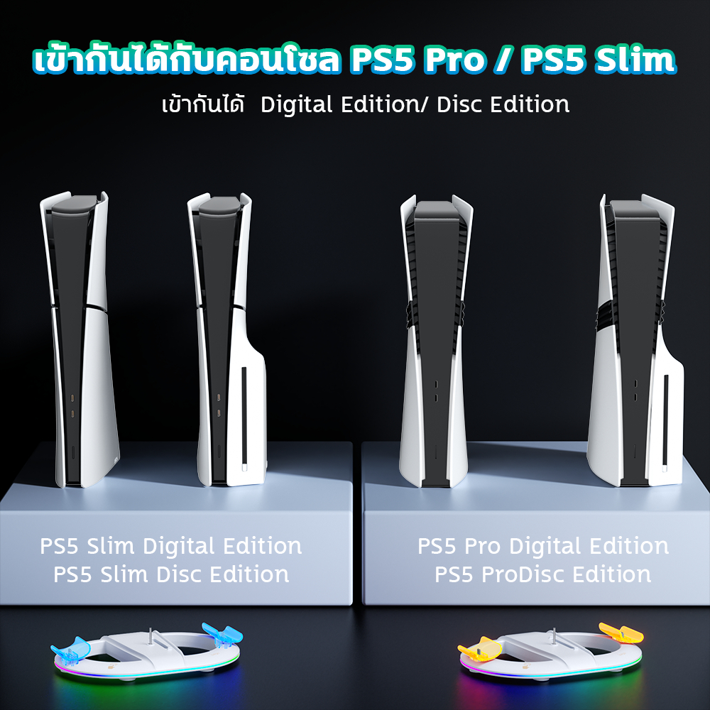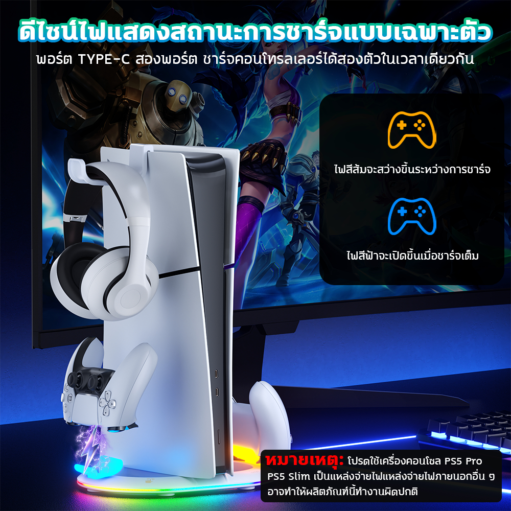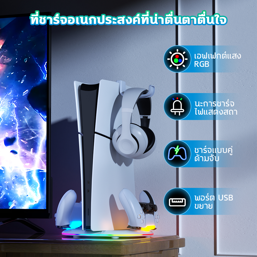 ขาตั้งแนวตั้ง PS5 Pro/Slim พร้อมแท่นชาร์จคอนโทรลเลอร์ ไฟ RGB + ที่แขวนหูฟังพรีเมียม