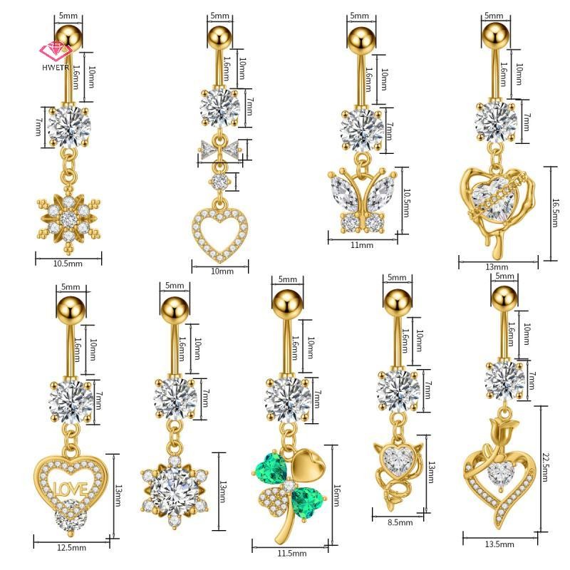 HWETR Zircon Belly ปุ่มแหวนสแตนเลสจี้หัวใจ Navel เจาะ Barbell สําหรับผู้หญิง Belly แหวนเครื่องประดับชายหาดใหม่