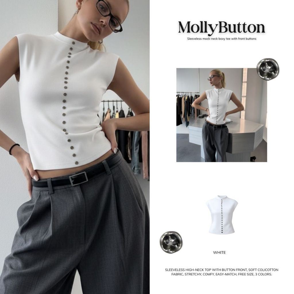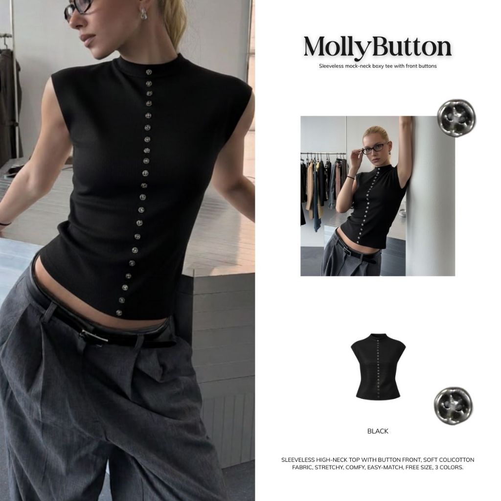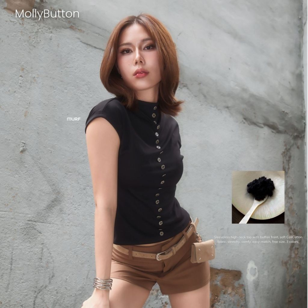 MollyButton | เสื้อคอปีนแขนกุด แต่งกระดุมหน้า ColiCotton ผ้านุ่ม ใส่สบาย | MURF.BKK | Drop Shoulder Boxy Top T161