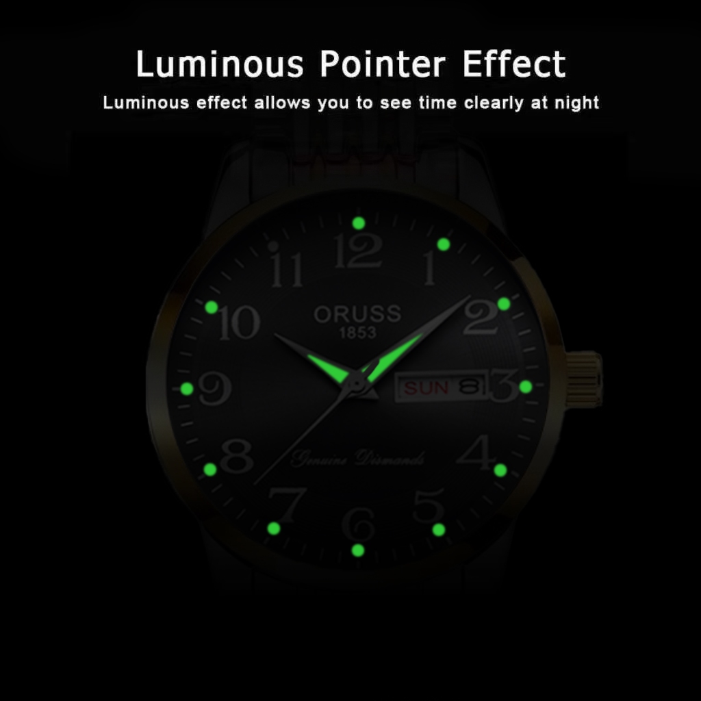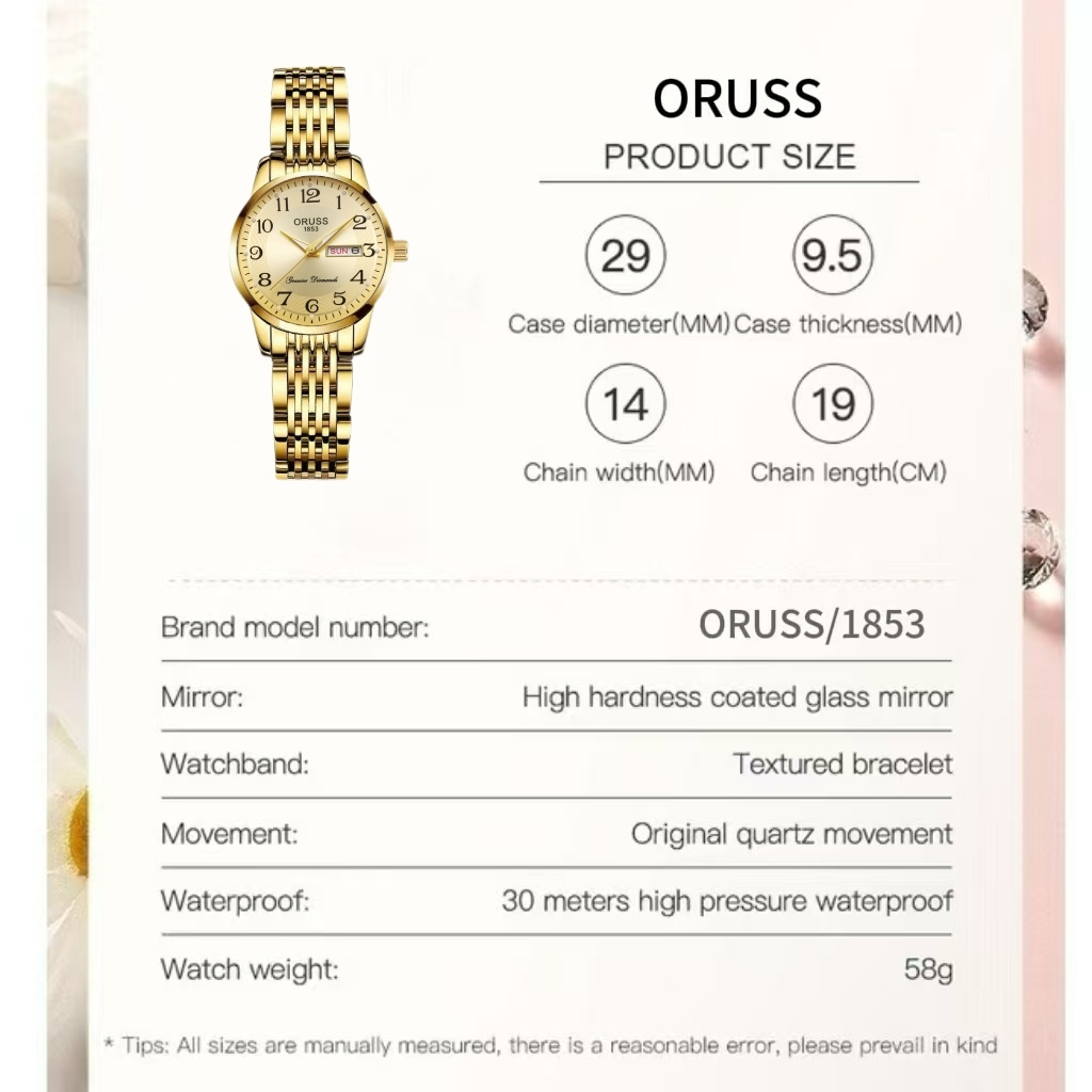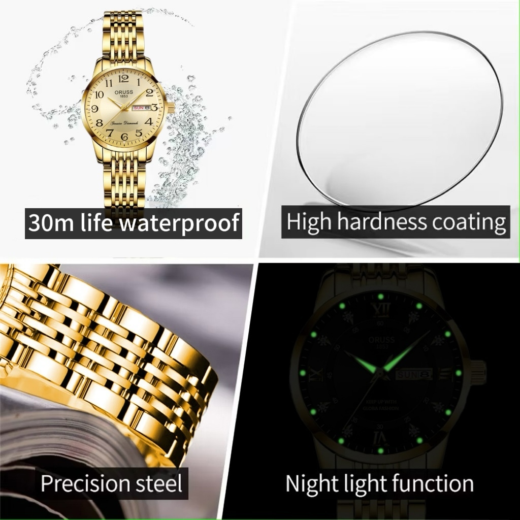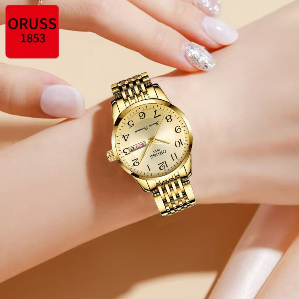 ORUSS รัส ต้นฉบับหญิงสแตนเลสหรูหราทองกันน้ําปฏิทินคู่ส่องสว่างแฟชั่นนาฬิกาขนาดเล็กเวอร์ชั่นเกาหลีนาฬิกาข้อมือควอตซ์