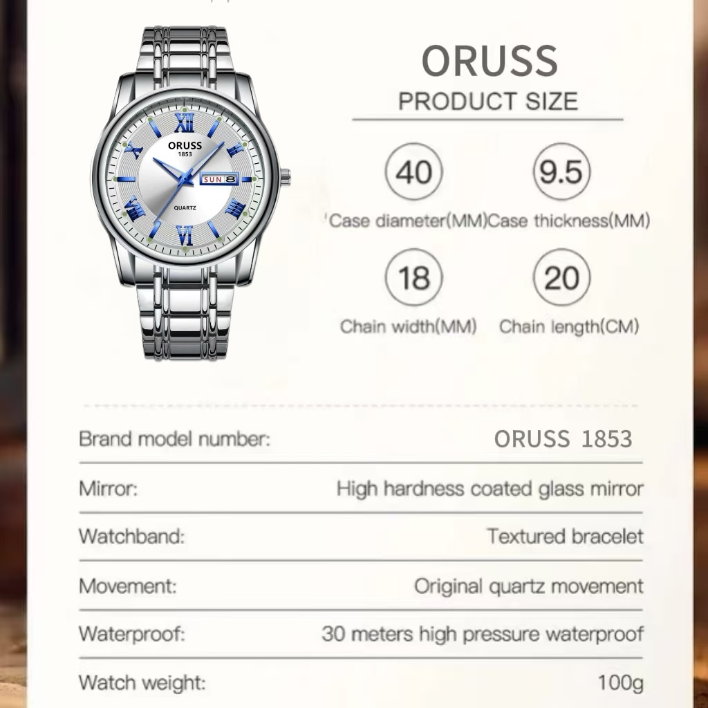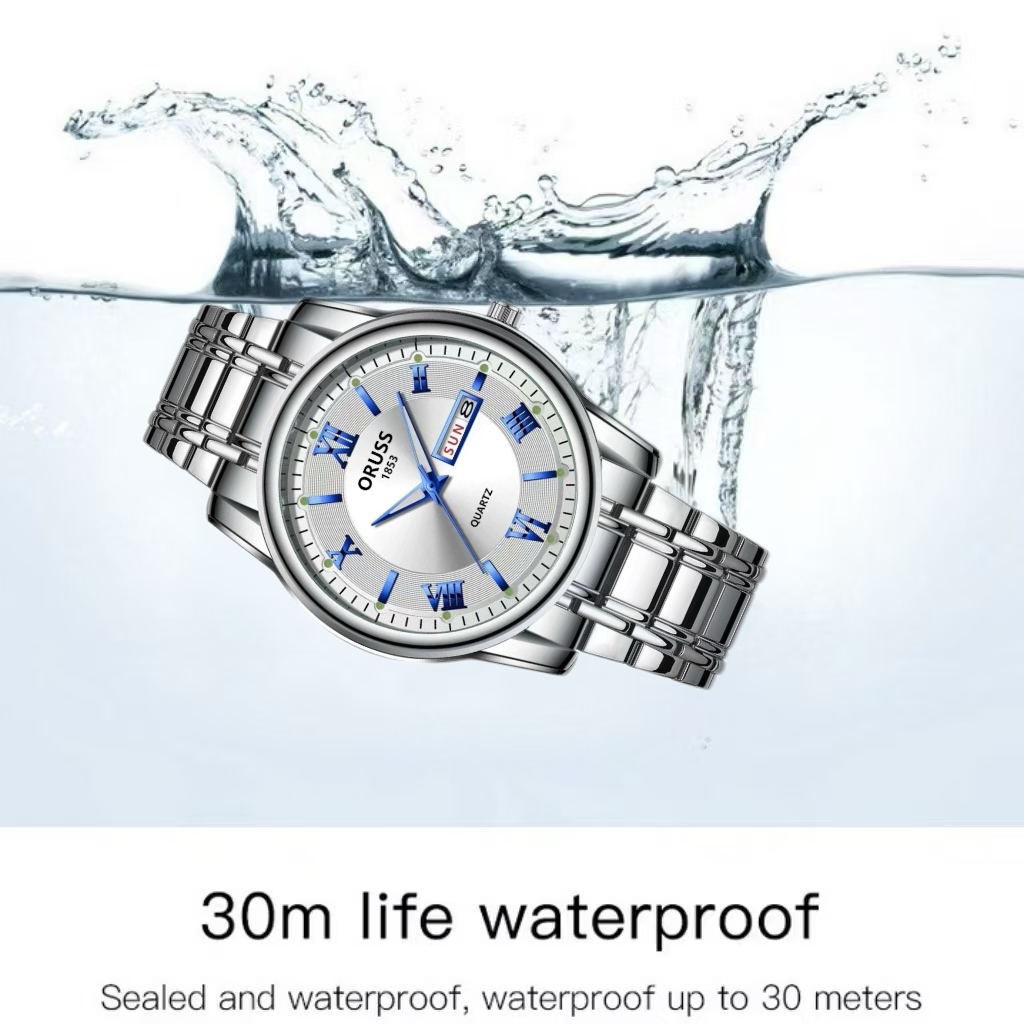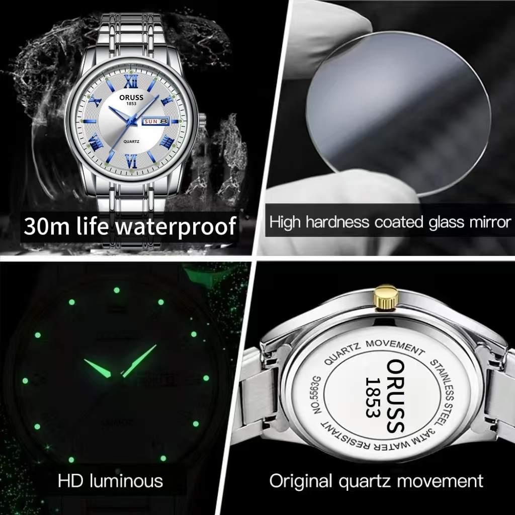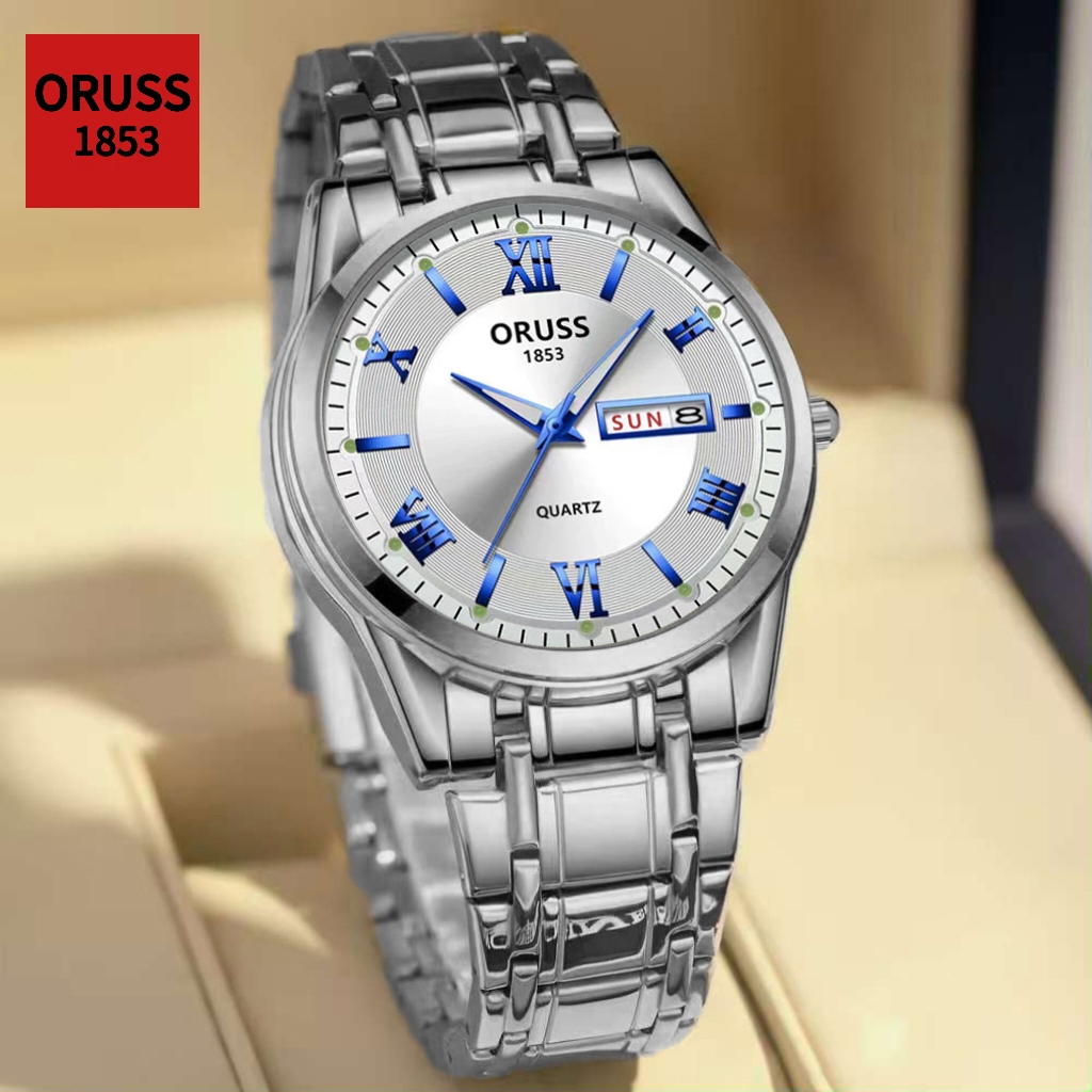 ORUSS Original Mens Dual Calendar สแตนเลสหรูหรากันน้ํา Luminous นาฬิกาแฟชั่นเงินเกาหลีนาฬิกาข้อมือควอตซ์