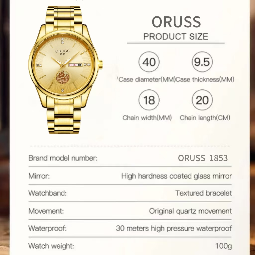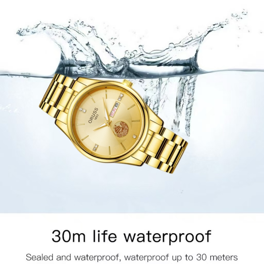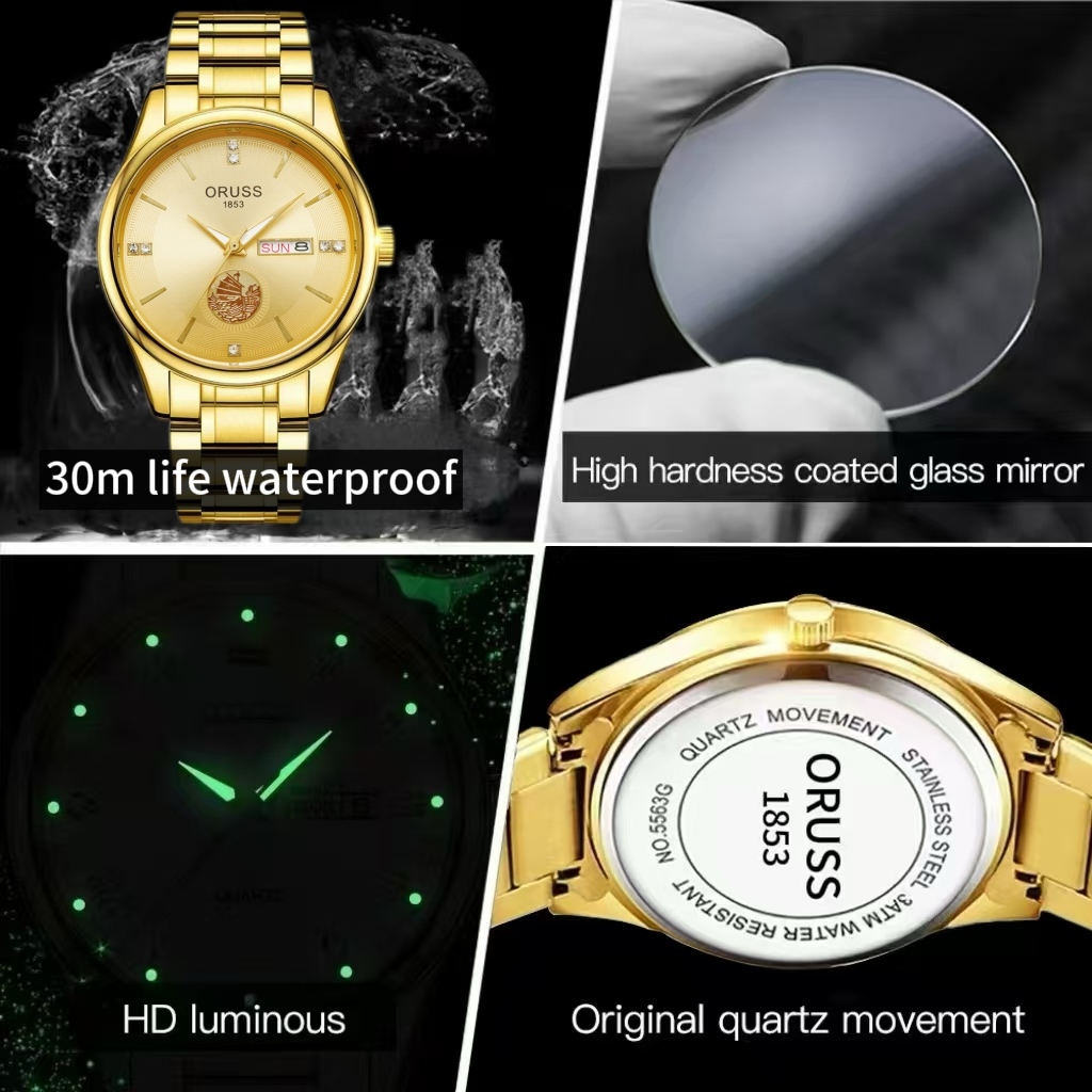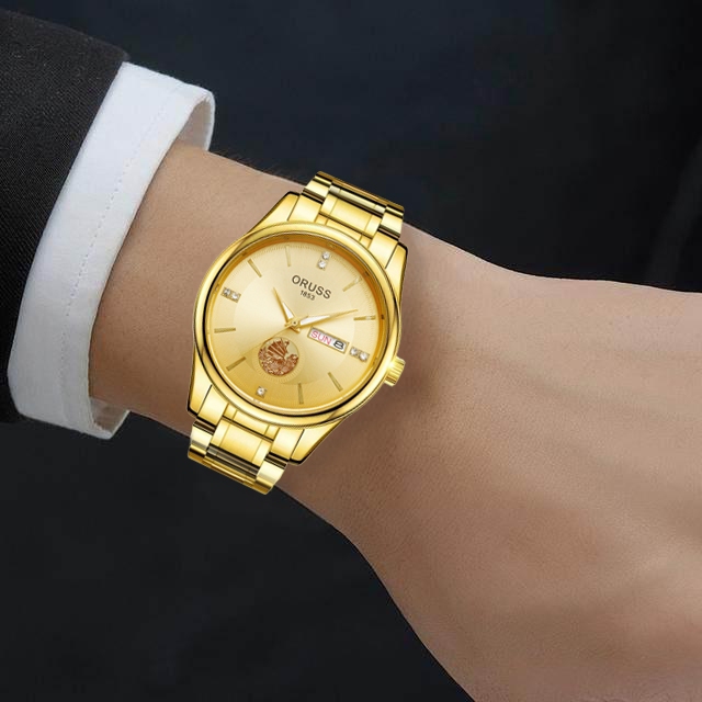 ORUSS รัส ต้นฉบับชายสีทองหรูหราสแตนเลสส่องสว่างปฏิทินคู่กันน้ํานาฬิกาแฟชั่นธุรกิจเกาหลีรุ่นควอตซ์นาฬิกาข้อมือ