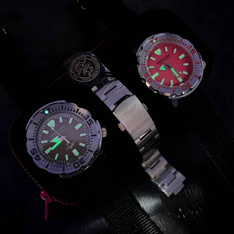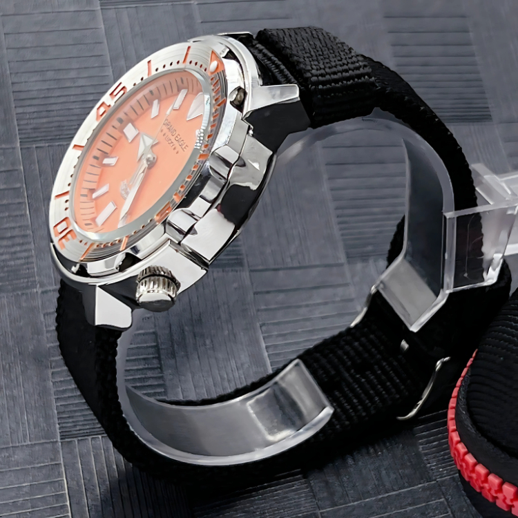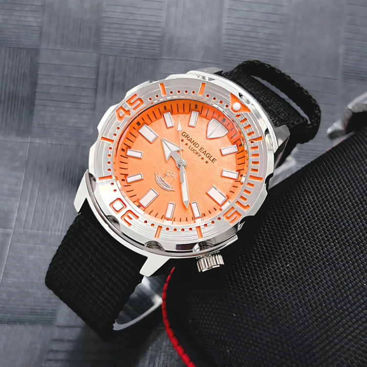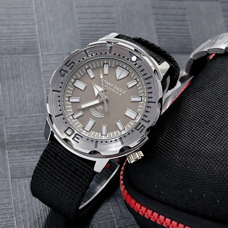 นาฬิกา GRAND EAGLE สายผ้า ขอบสแตนเลส ขอบหมุนได้ พรายน้ำ (ได้สาย2เส้น)