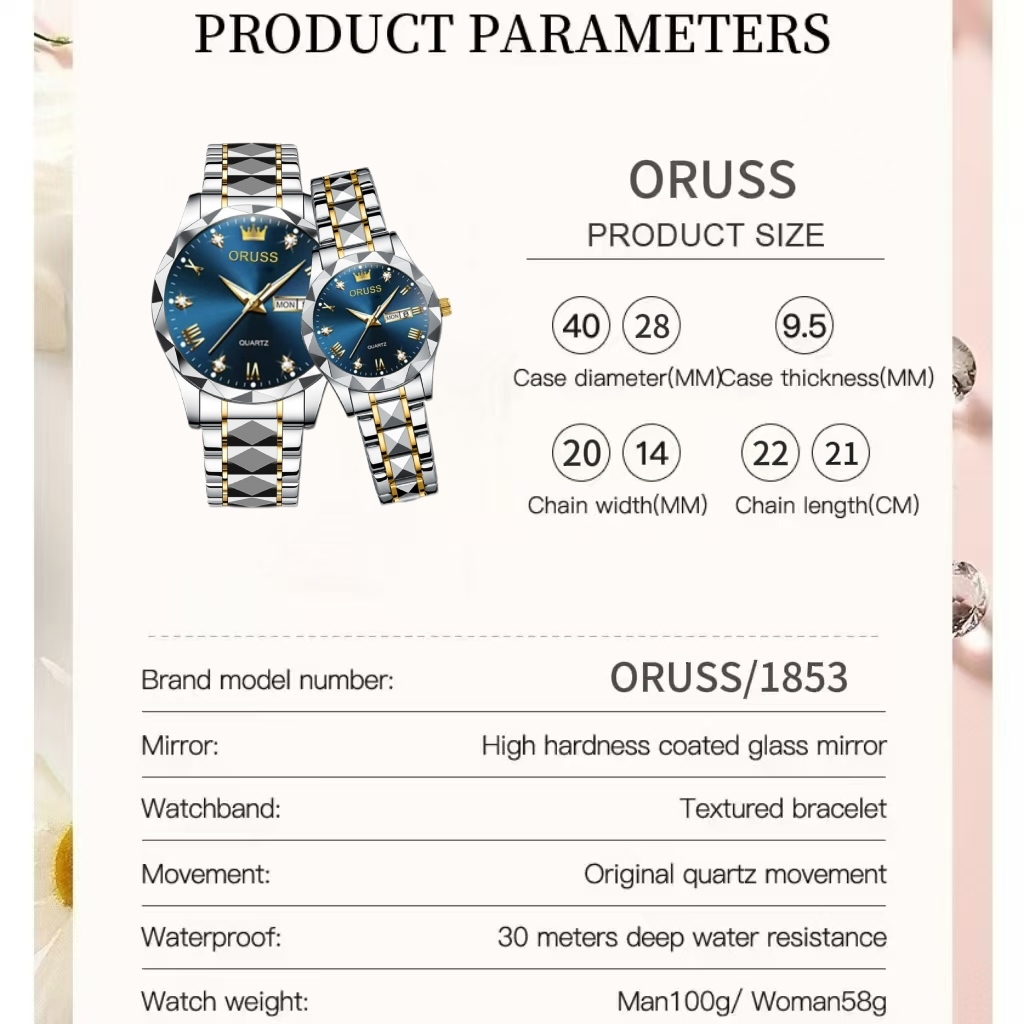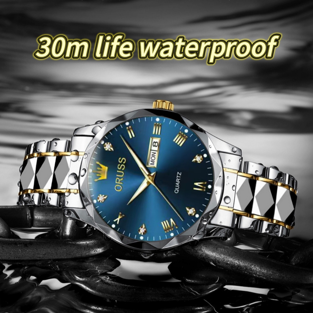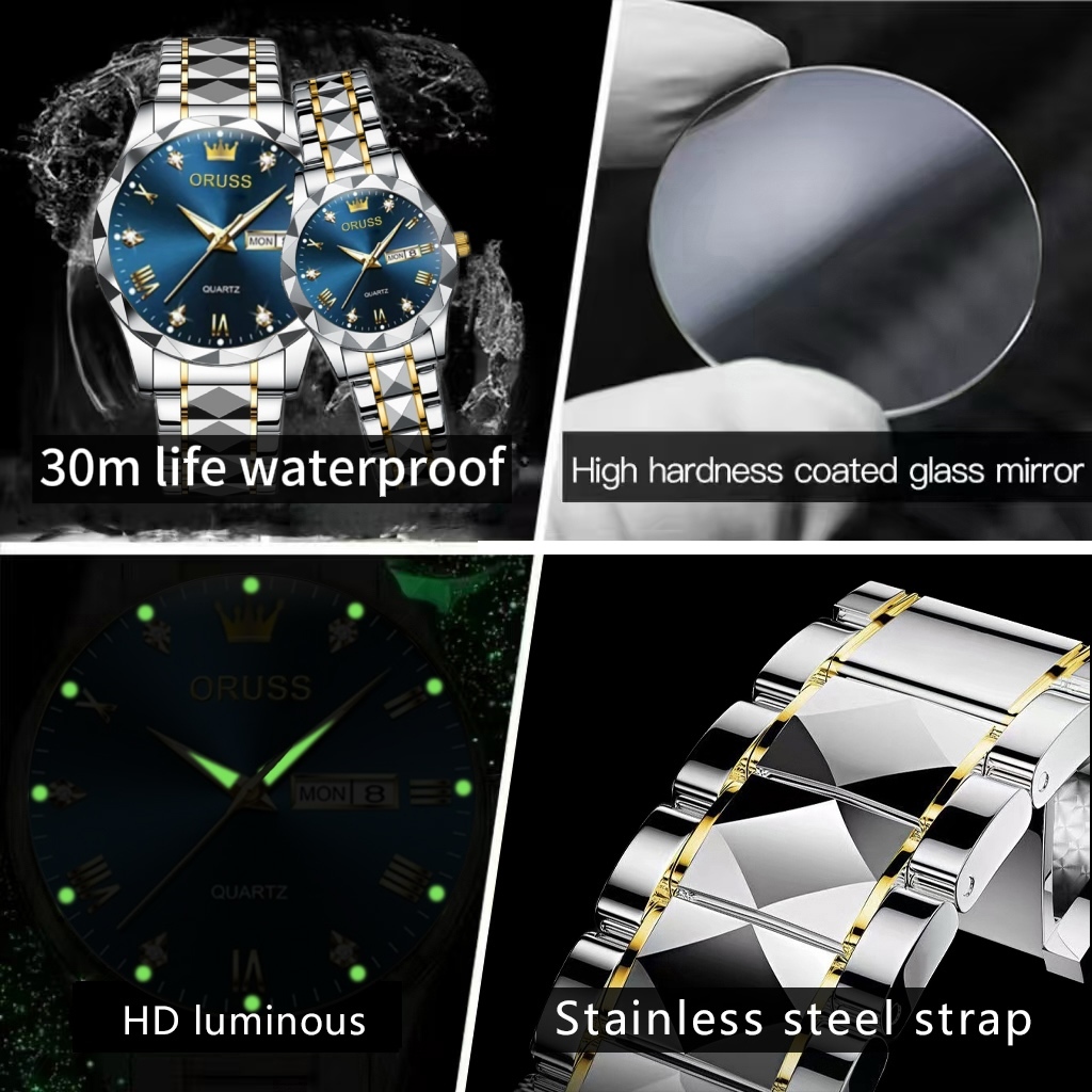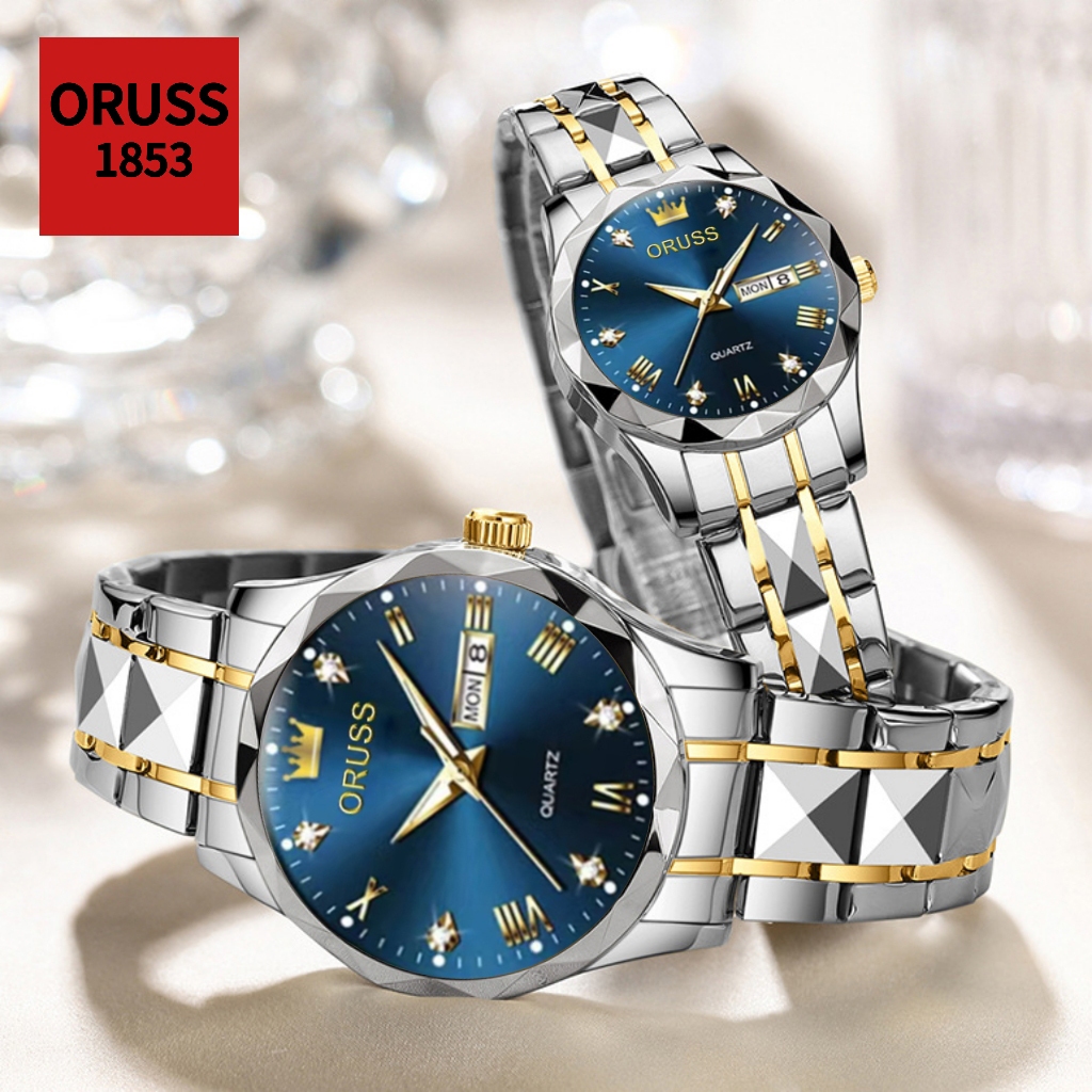 ORUSS รัส คู่เดิมสแตนเลสปฏิทินคู่กันน้ําส่องสว่างนาฬิกาแฟชั่นหรูหราธุรกิจเวอร์ชั่นเกาหลีนาฬิกาข้อมือควอตซ์