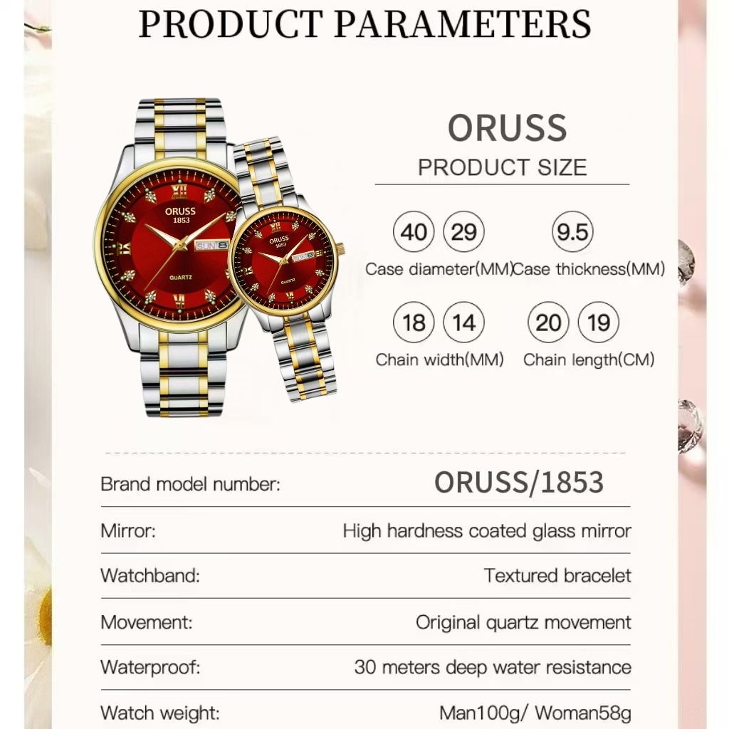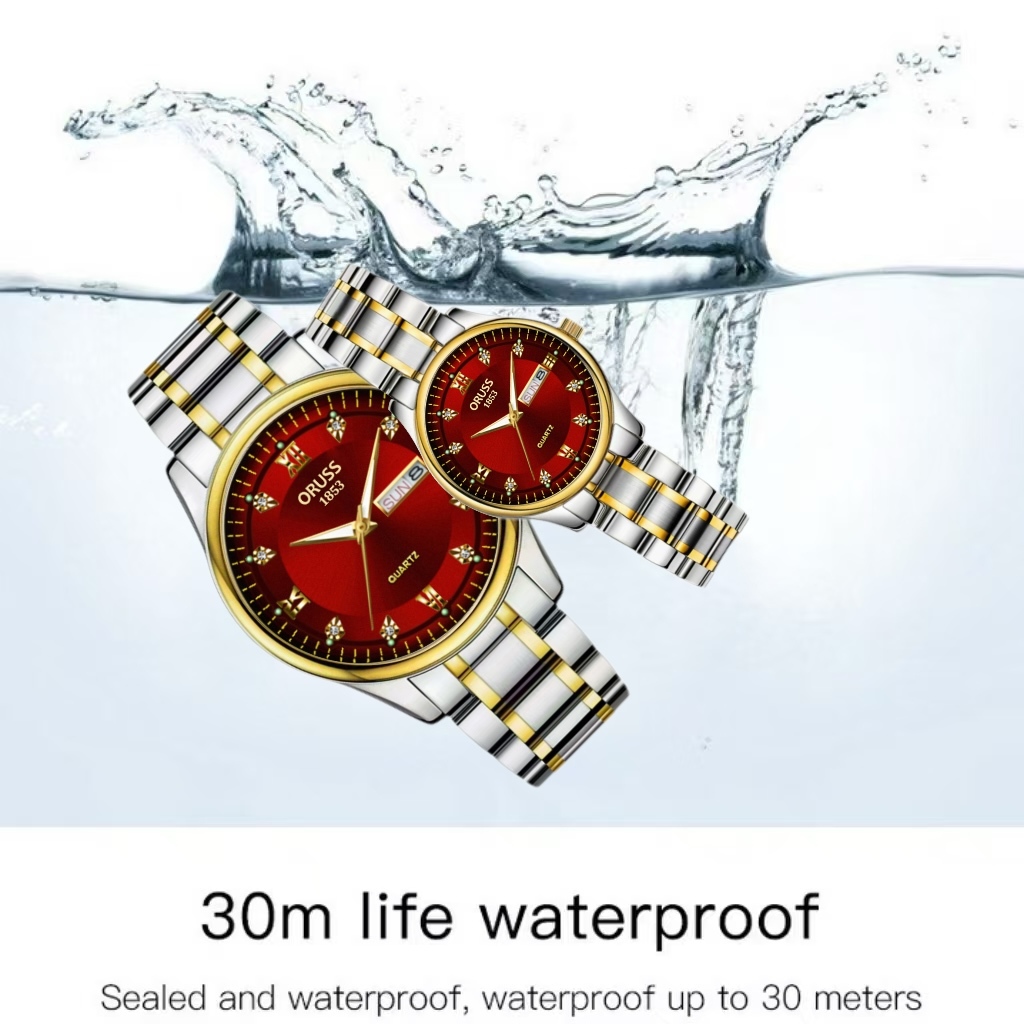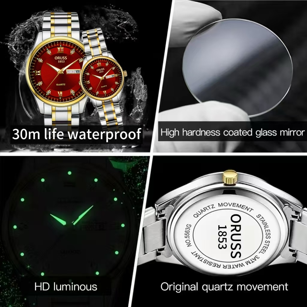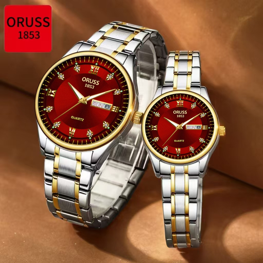 ORUSS Original 2 ชิ้นคู่สแตนเลสสีแดง Dial Dual ปฏิทินหรูหรากันน้ํา Luminous นาฬิกาแฟชั่นเกาหลีรุ่นนาฬิกาควอตซ์