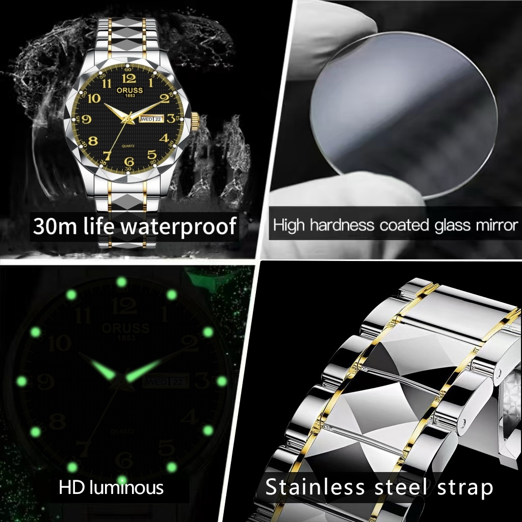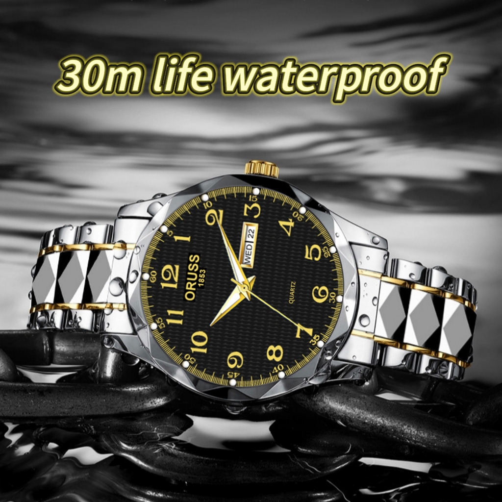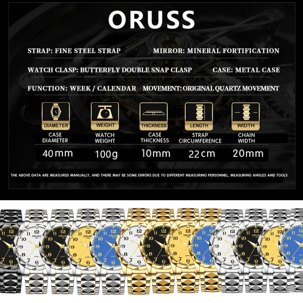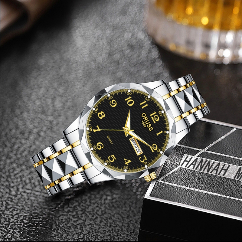 ORUSS รัส ต้นฉบับชายหรูหราสแตนเลสส่องสว่างกันน้ําปฏิทินคู่นาฬิกาเงินแฟชั่นเกาหลีรุ่นควอตซ์นาฬิกาข้อมือ