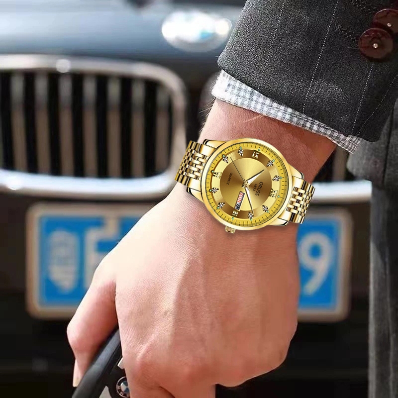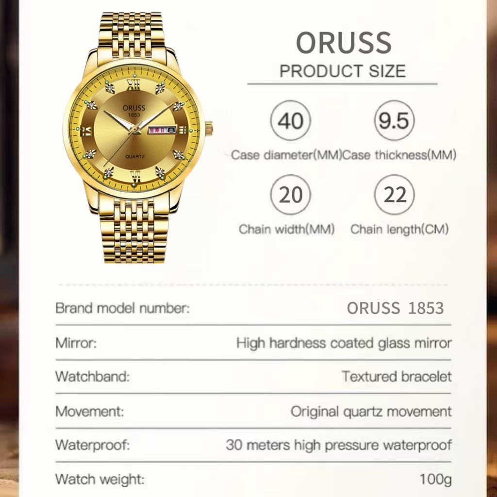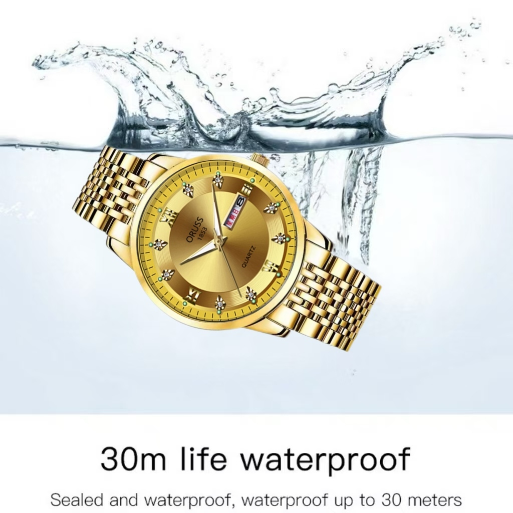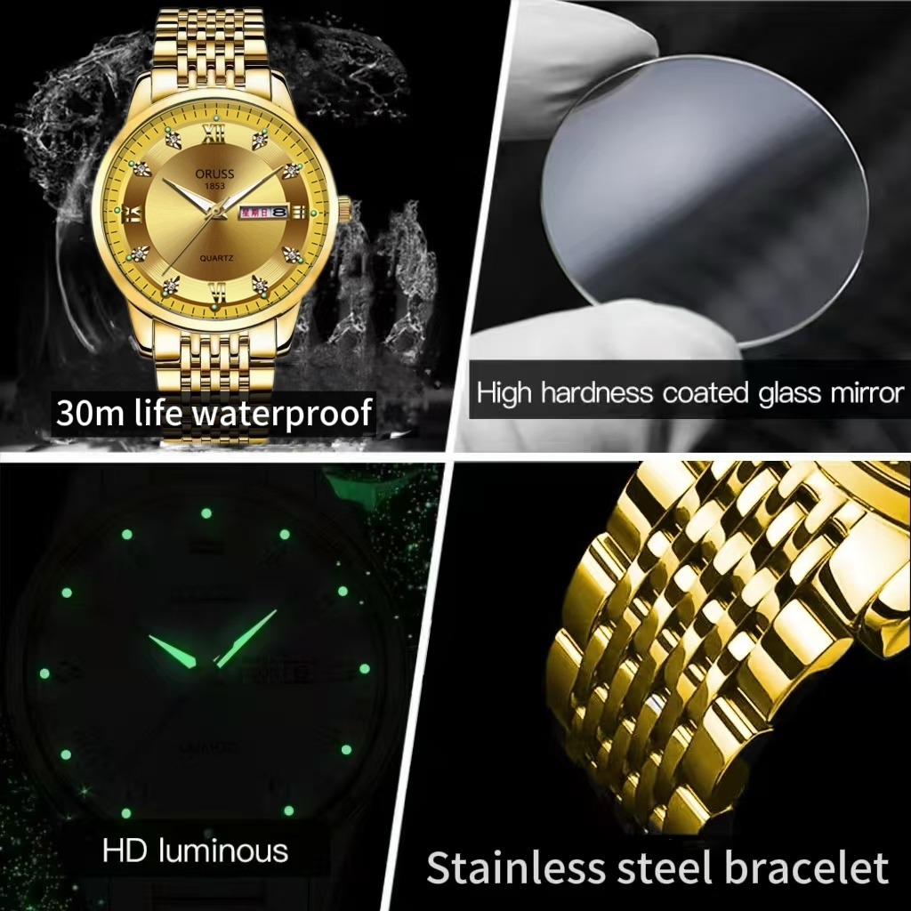 ORUSS รัส ต้นฉบับ ผู้ชายทองสแตนเลสหรูหราส่องสว่างปฏิทินคู่กันน้ํานาฬิกาแฟชั่นธุรกิจเกาหลีรุ่นควอตซ์นาฬิกาข้อมือ