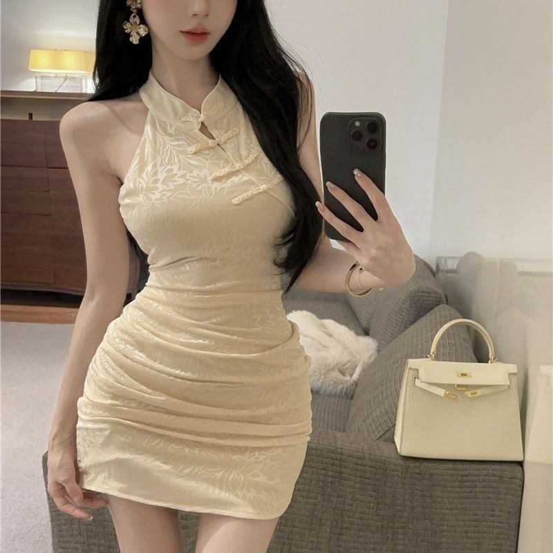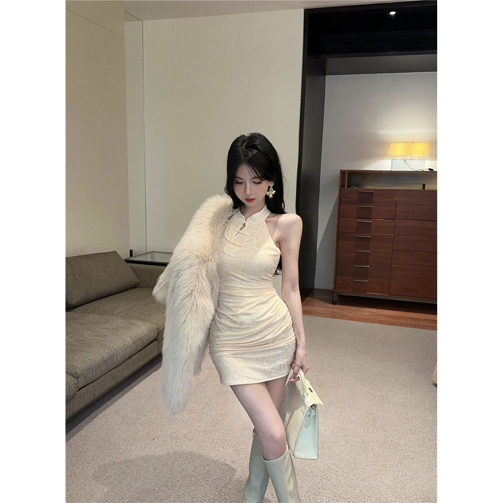 Veewink พร้อมส่งจากกทม เดรสกี่เพ้า เนื้อผ้ากำมะหยี่ คอฮอล์เตอร์ กระชับเอว กระโปรงรัดก้น ลุคสาวสังคมเซ็กซี่