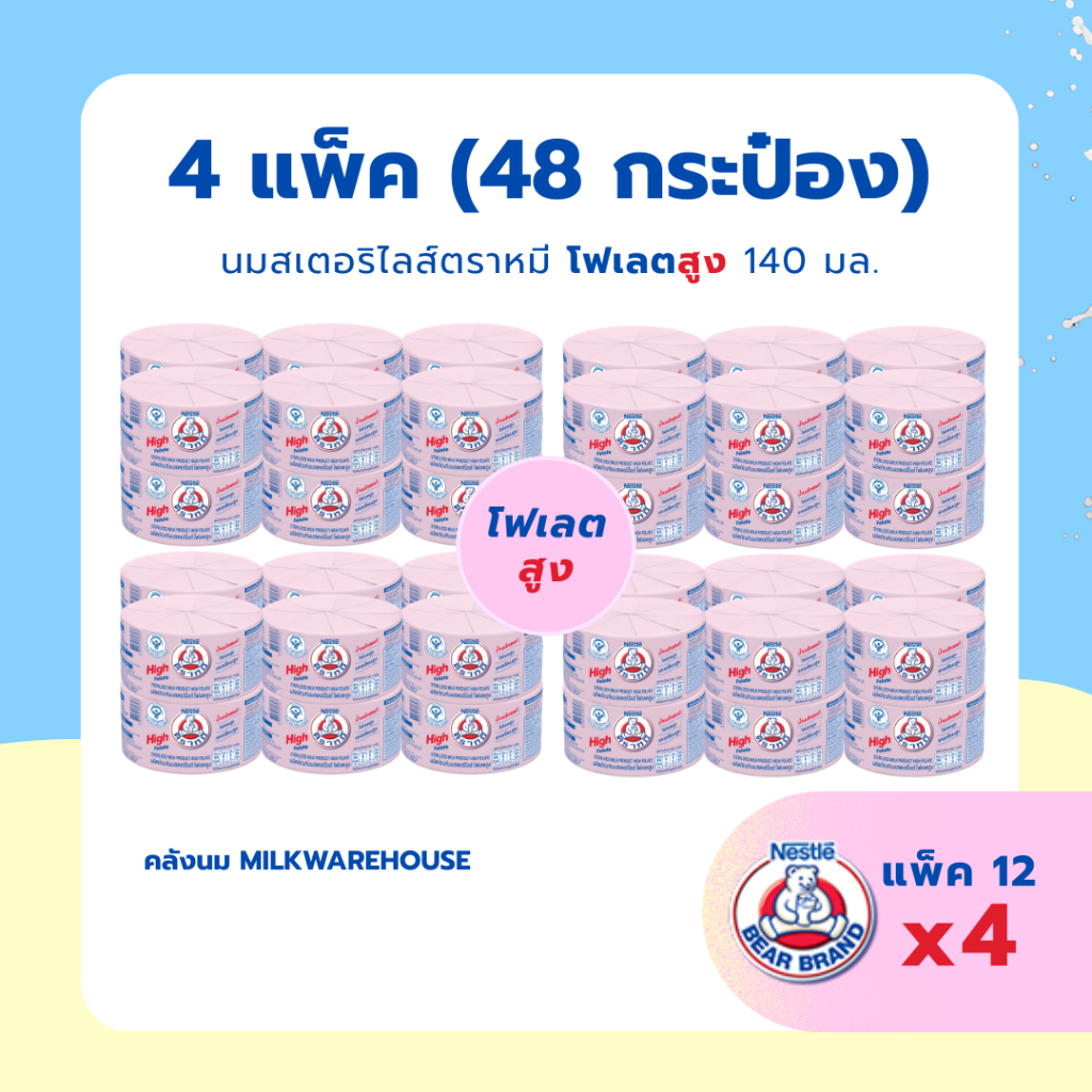 นมสเตอริไลส์ตราหมี โฟเลตสูง (ยกลัง) / Bear Brand Sterilized Milk High Folate 140 ml (96 Bottles)