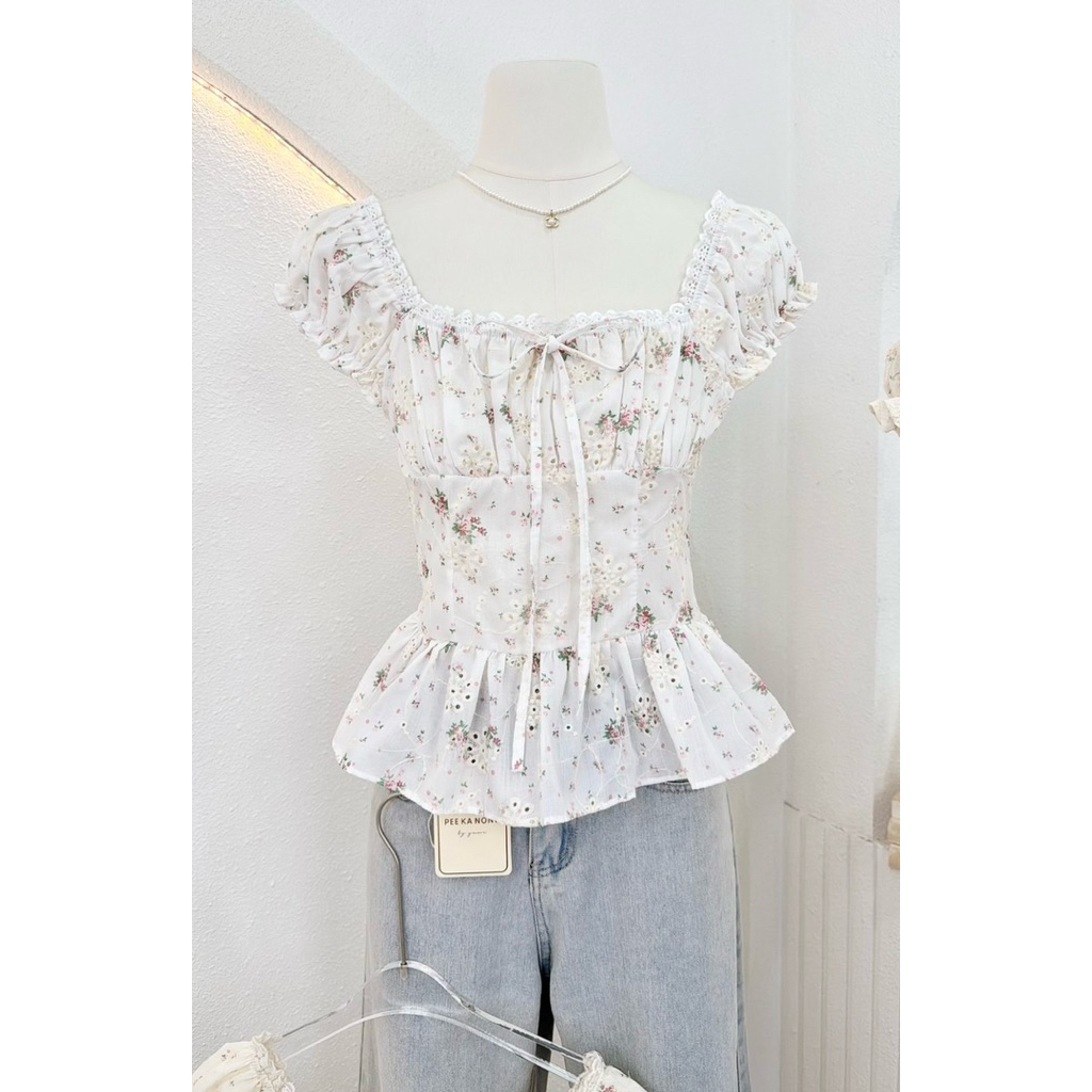 NN703 เสื้อครอปแขนตุ๊กตาลายดอกไม้ผ้าปักฉลุ Peekanong🌷