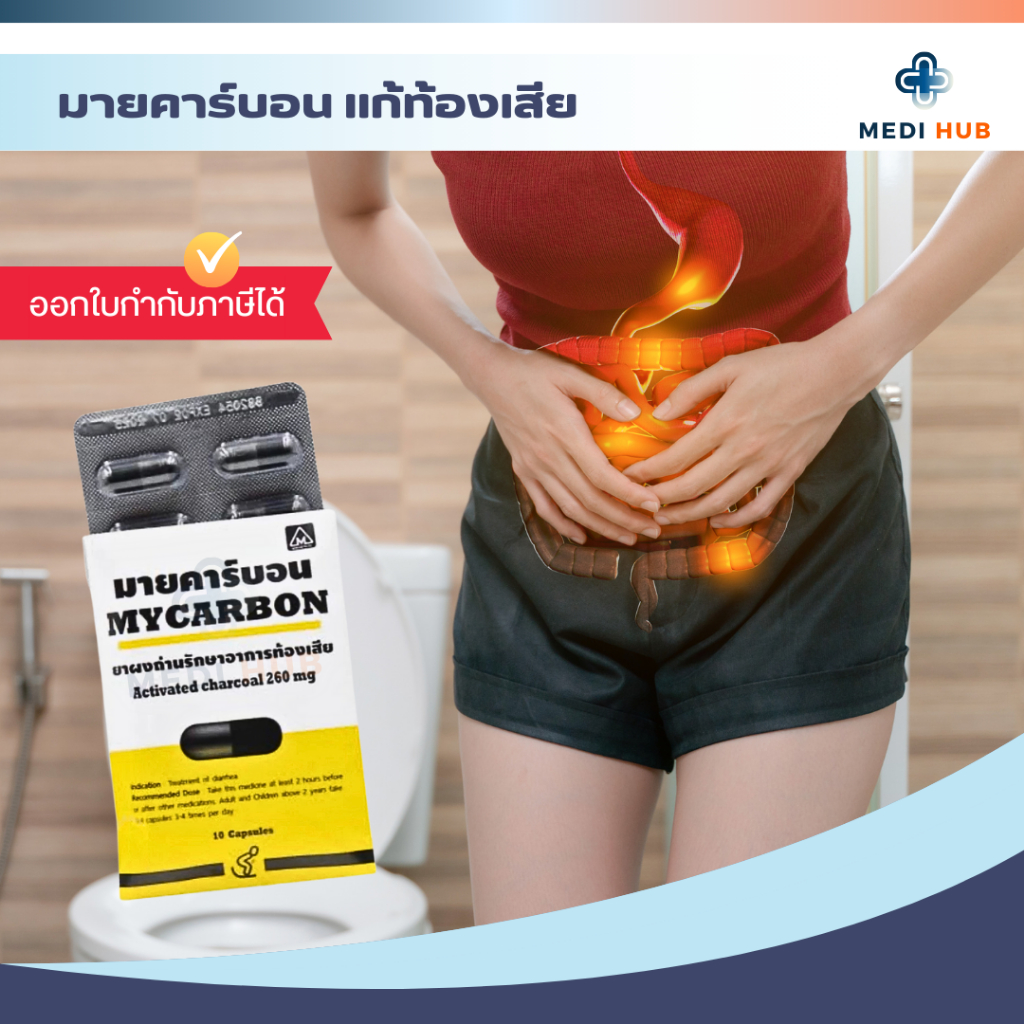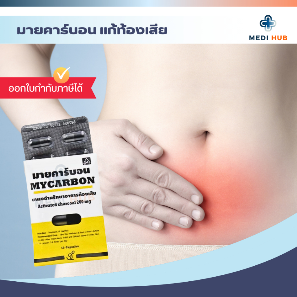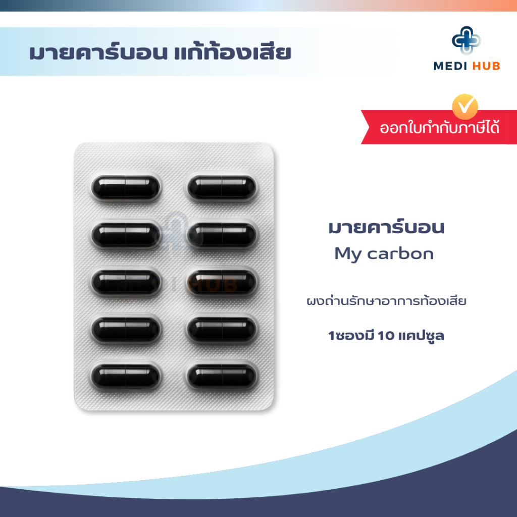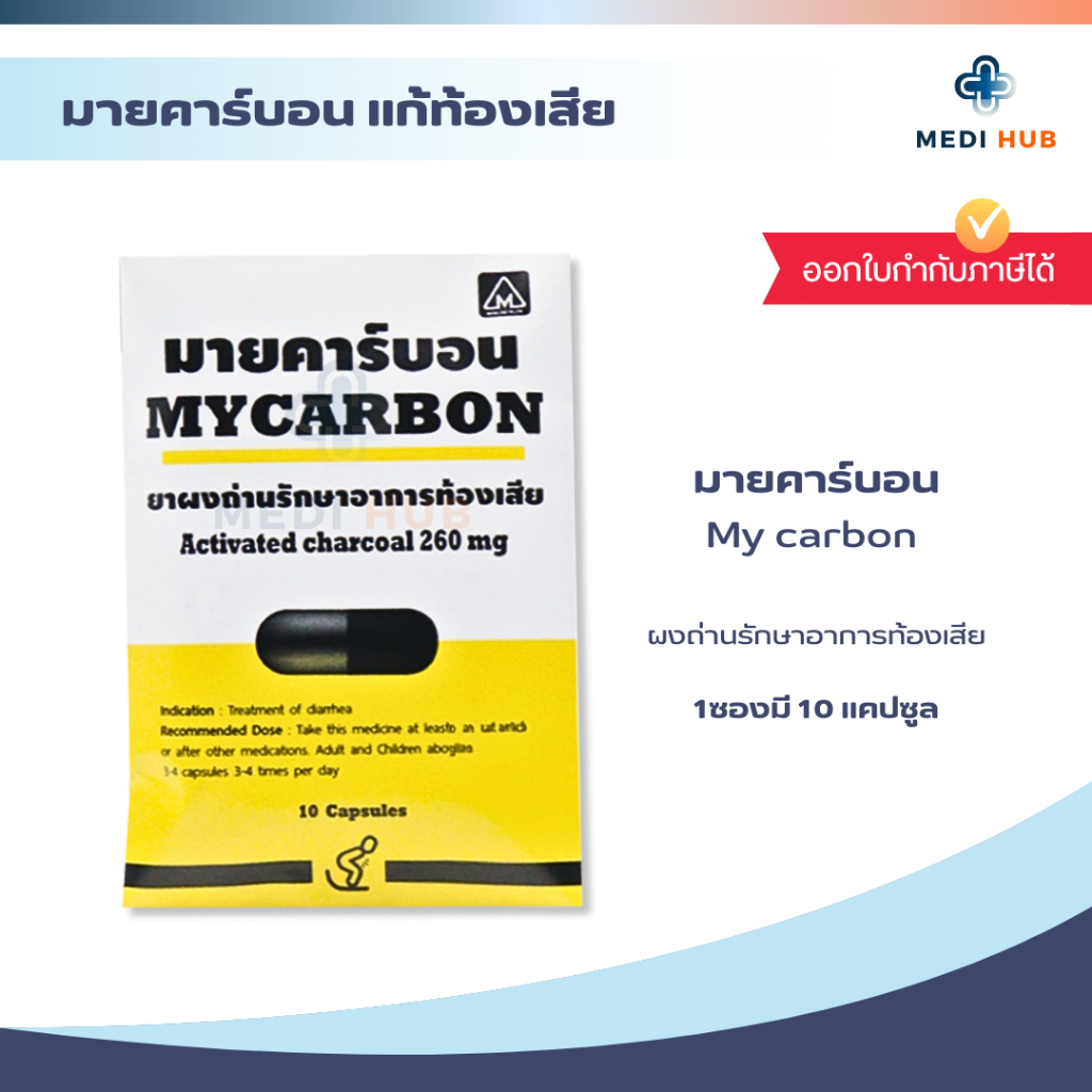 Mycarbon ผงถ่าน มายคาร์บอน (จำนวน 1 ซอง) แก้ท้องเสีย 260มก ซองละ 10 แคปซูล