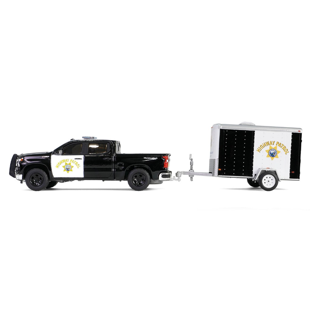 Greenlight Hot Pursuit Hitch & Tow | 2023 Chevrolet Silverado with Small Cargo Trailer – California สเกล 1/64 32315