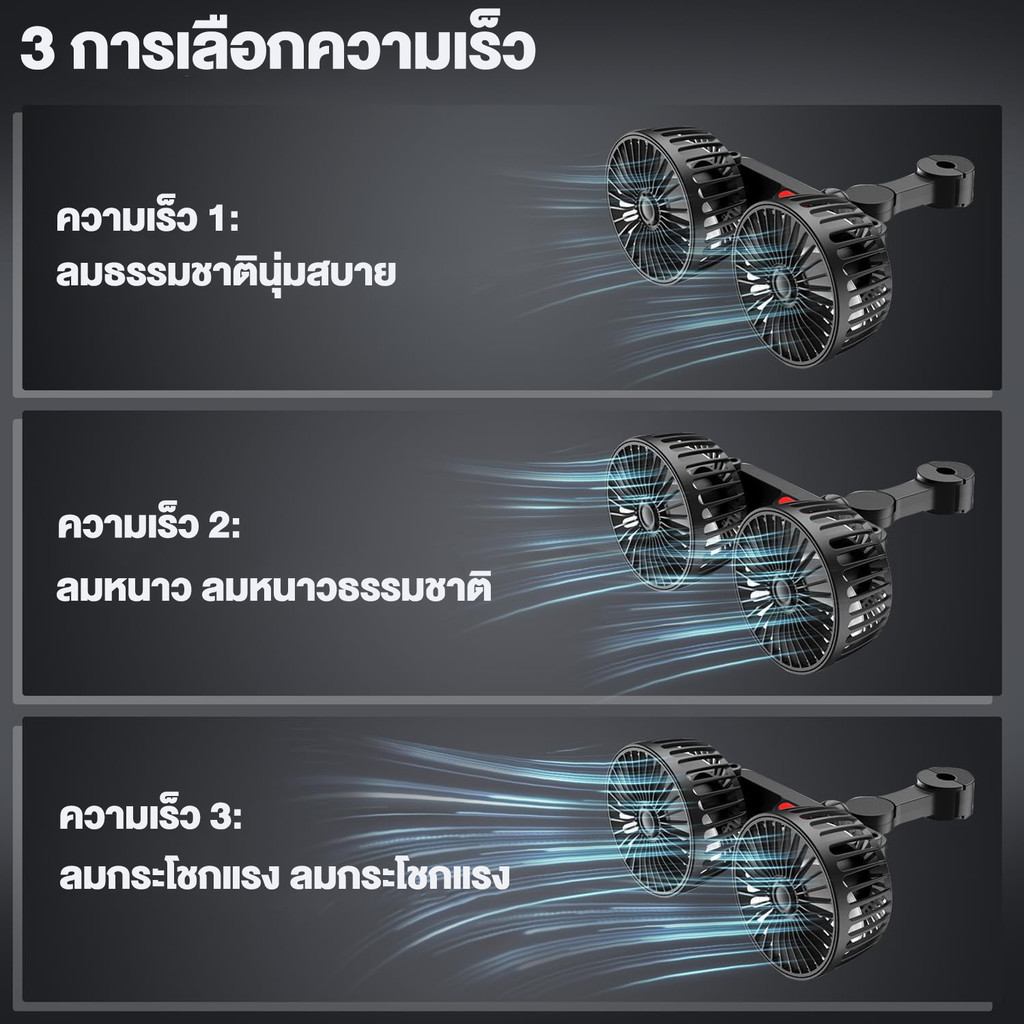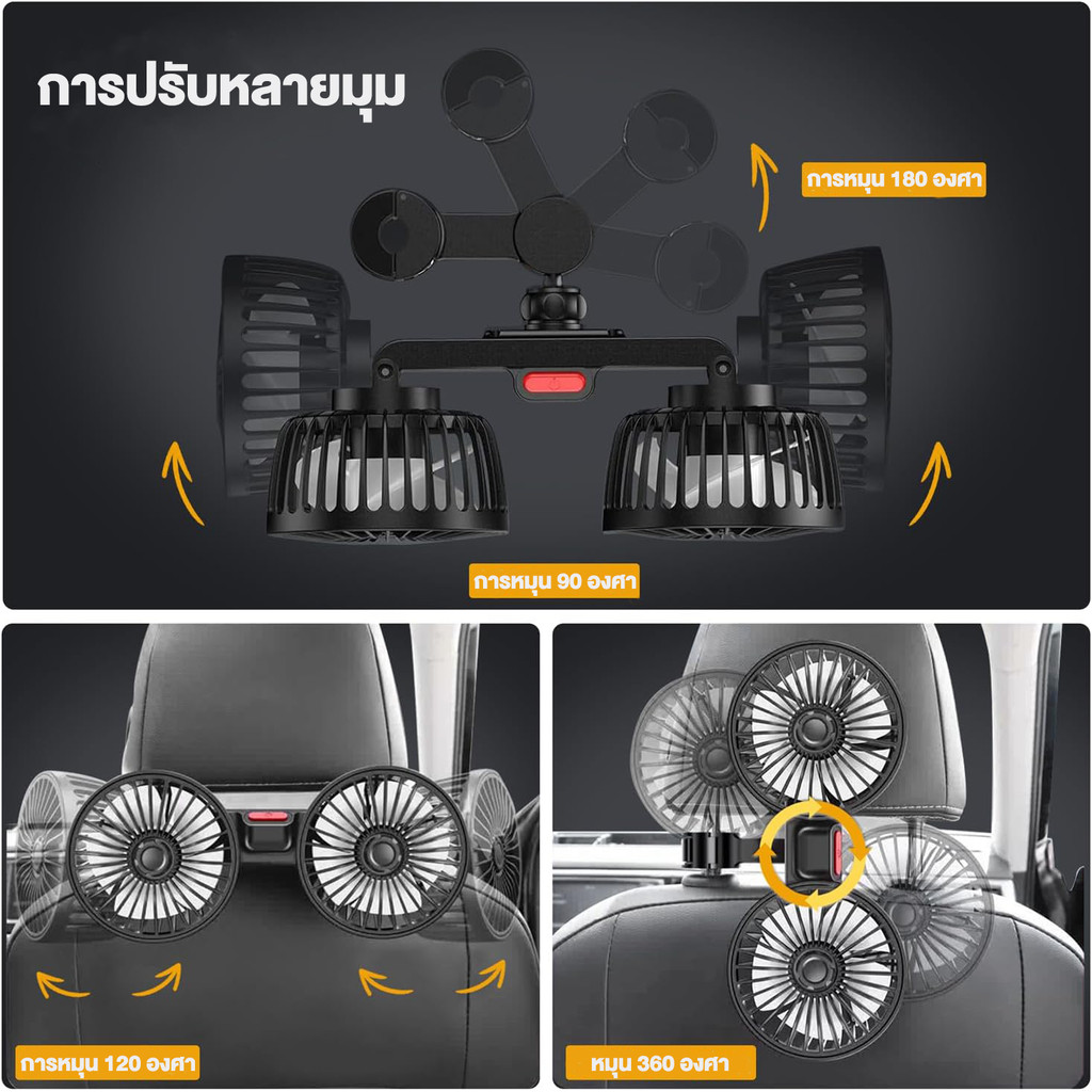 SEAMETAL พัดลมติดรถยนต์หัวคู่ ชาร์จ USB ลมใหญ่ พัดลมเบาะหลังควบคุมความเร็วสามระดับ