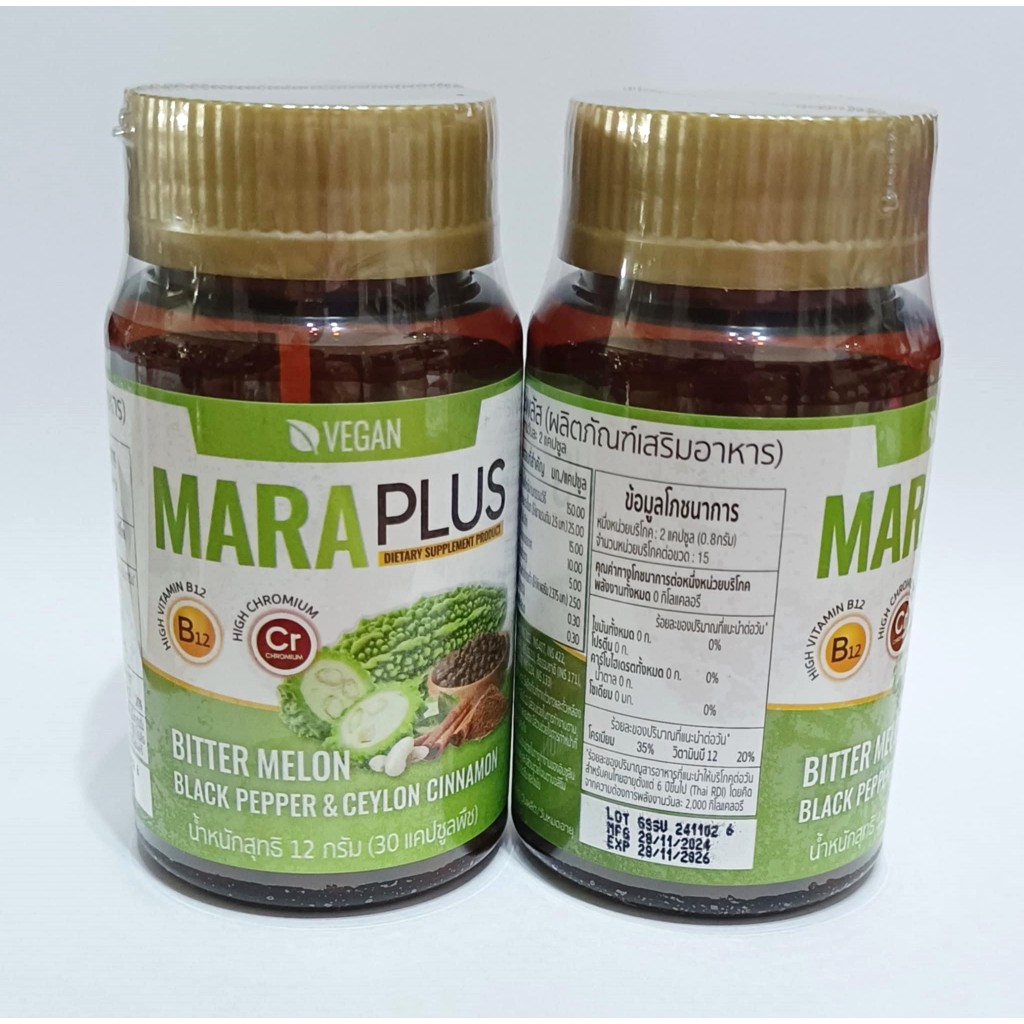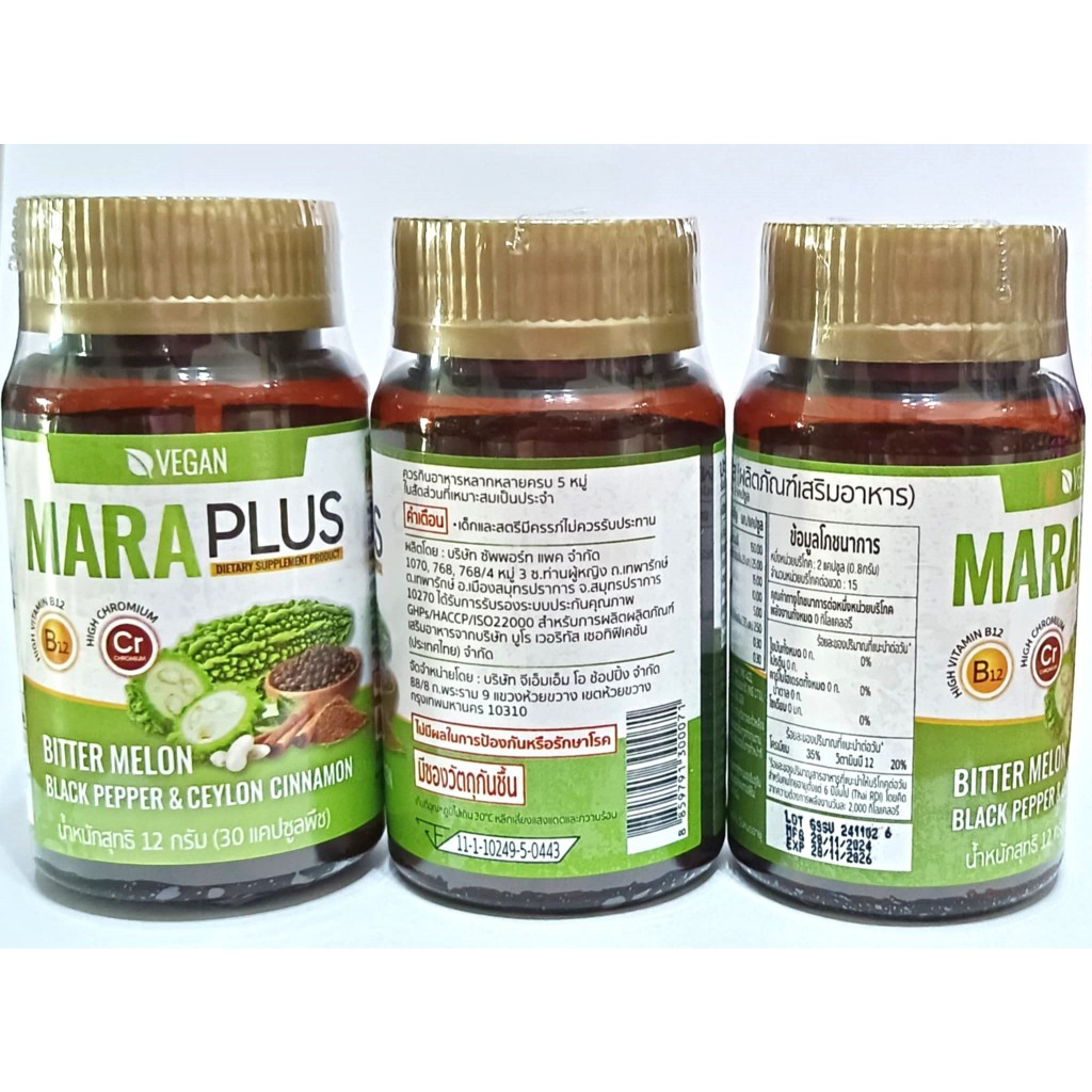 Maraplus มะระพลัส 1 กระปุก บรรจุ 30 เม็ด ซอฟเจล ผลิตภัณฑ์เสริมอาหาร ภาพแสดงสลากหน้าหลังรอบกระปุก มะระ หมดอายุ 2028