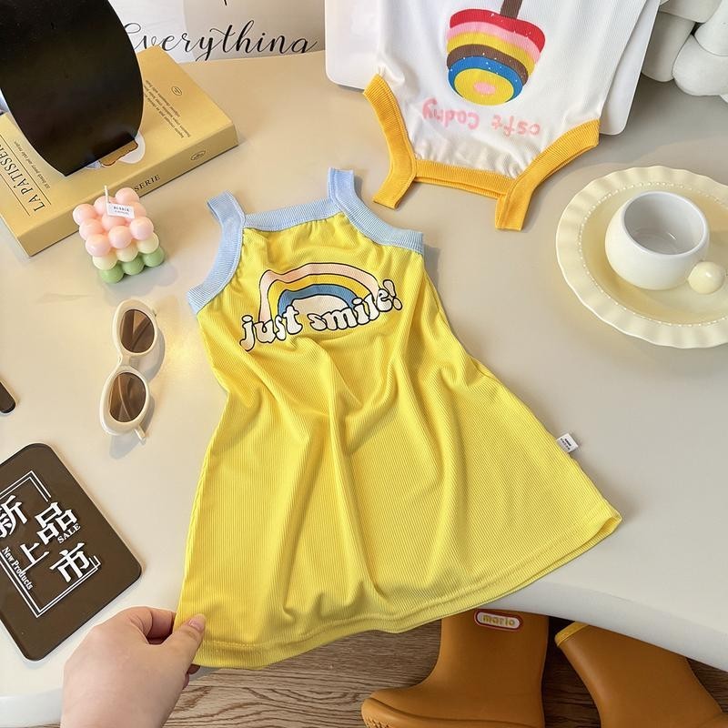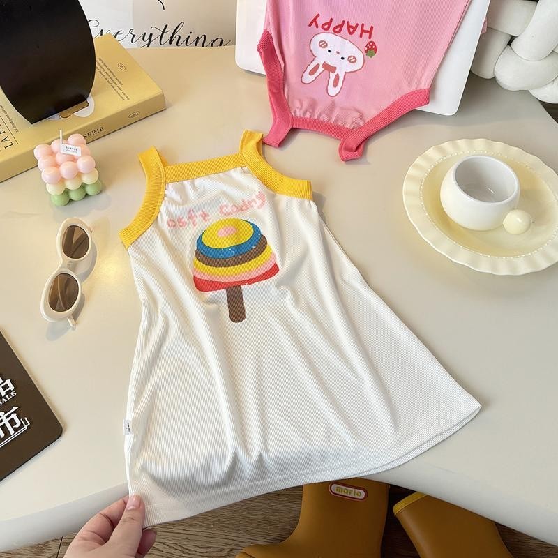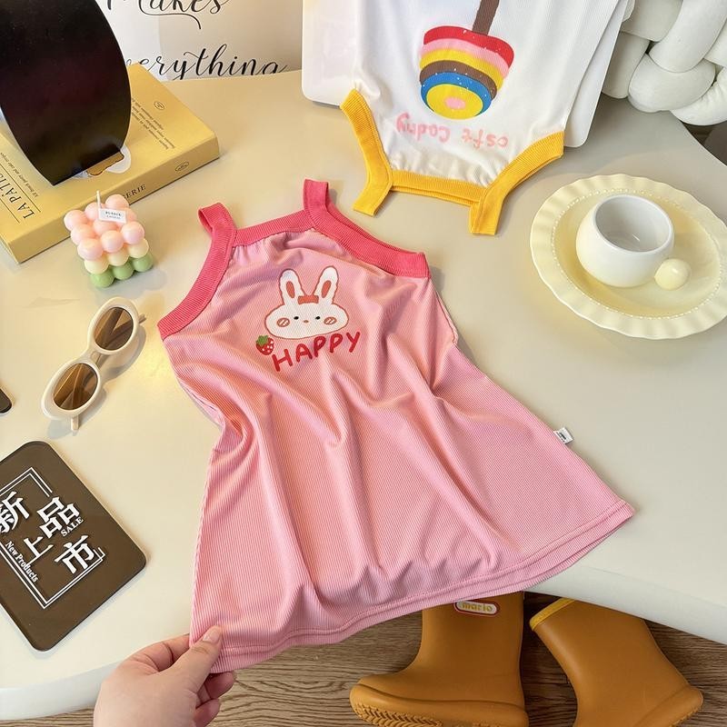 MooDeng Baby ชุดเดรส สายเดี่ยว แฟชั่น สำหรับเด็กหญิง ลายน่ารัก ผ้าร่อง ผ้ายืด ผ้านุ่มมาก ใส่สบาย ไม่ร้อน ระบายอากาศได้ดี