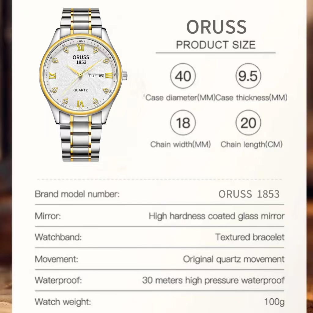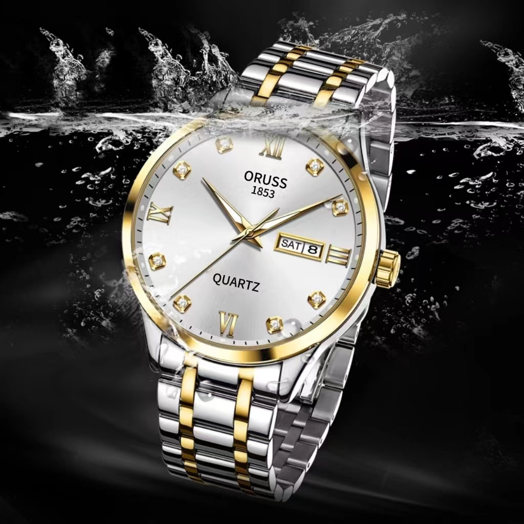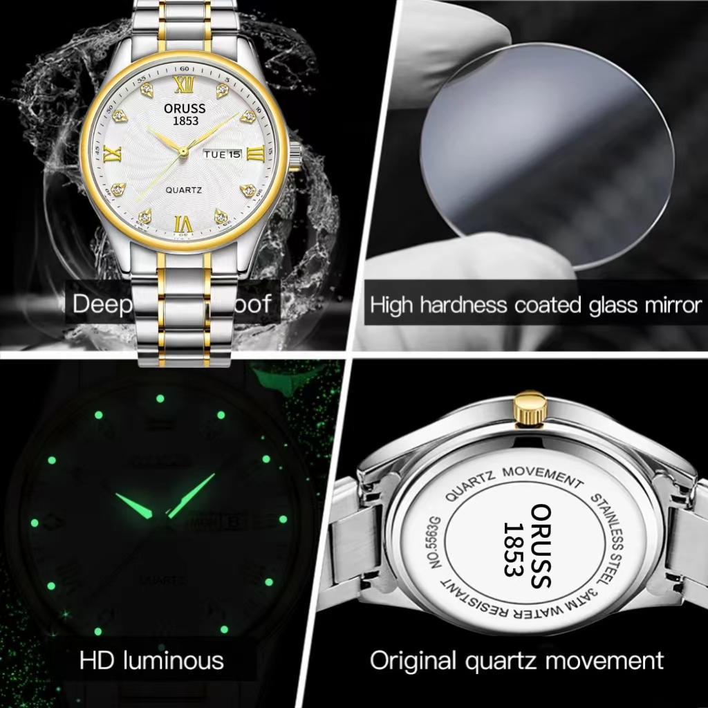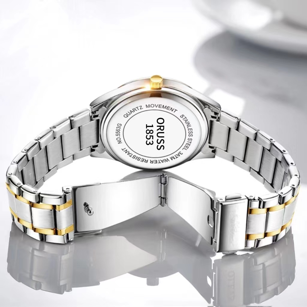 ORUSS รัส ต้นฉบับชาย/หญิงสแตนเลสปฏิทินคู่กันน้ําส่องสว่างหรูหรานาฬิกาแฟชั่นตัวชี้ทองเวอร์ชั่นเกาหลีนาฬิกาข้อมือชาย