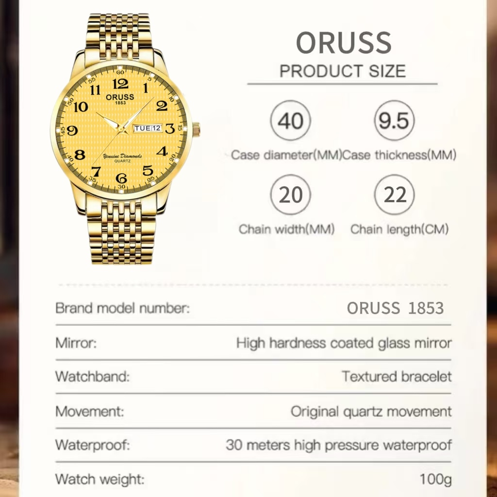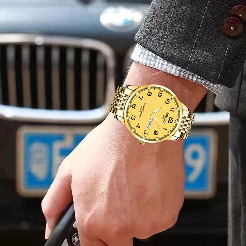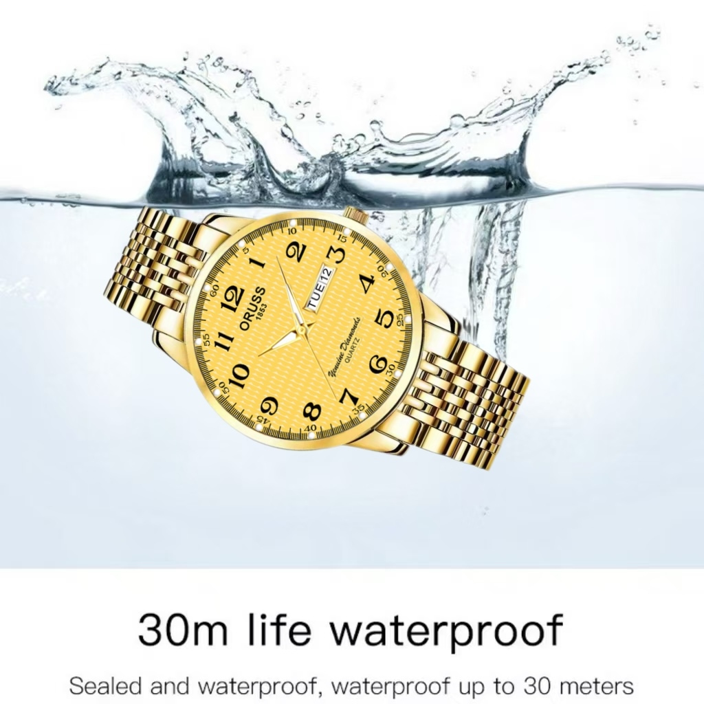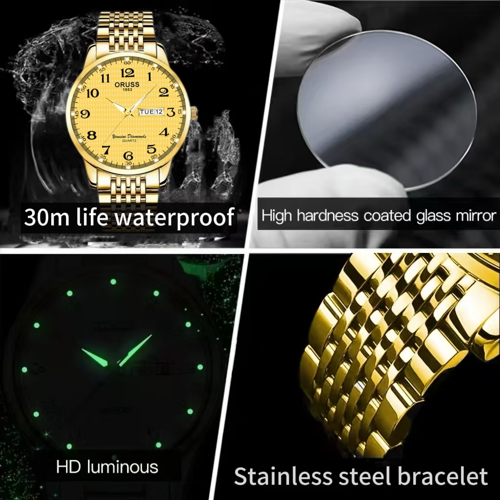 ORUSS รัส ต้นฉบับ ผู้ชายสแตนเลสทองหรูหราปฏิทินคู่ส่องสว่างกันน้ํานาฬิกาแฟชั่นธุรกิจเกาหลีรุ่นควอตซ์นาฬิกาข้อมือ