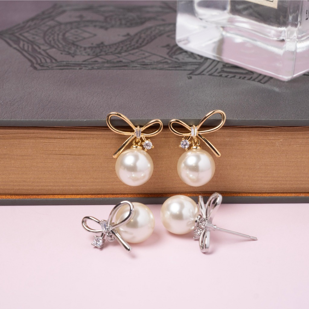 Vipalis ต่างหูมุกโบว์ ประดับเพชร CZ | ก้านเงินแท้ 925 | ดีไซน์หวานหรู ใส่ได้ทุกโอกาส พร้อมส่ง