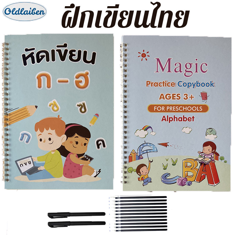 Oldlaiben เซ็ตสมุดฝึกคัดลายมือไทย + ปากกาล่องหน A4 ใหญ่! เรียนเขียน ก-ฮ ง่ายๆ สนุกสนาน