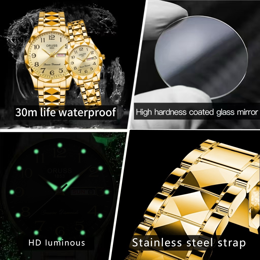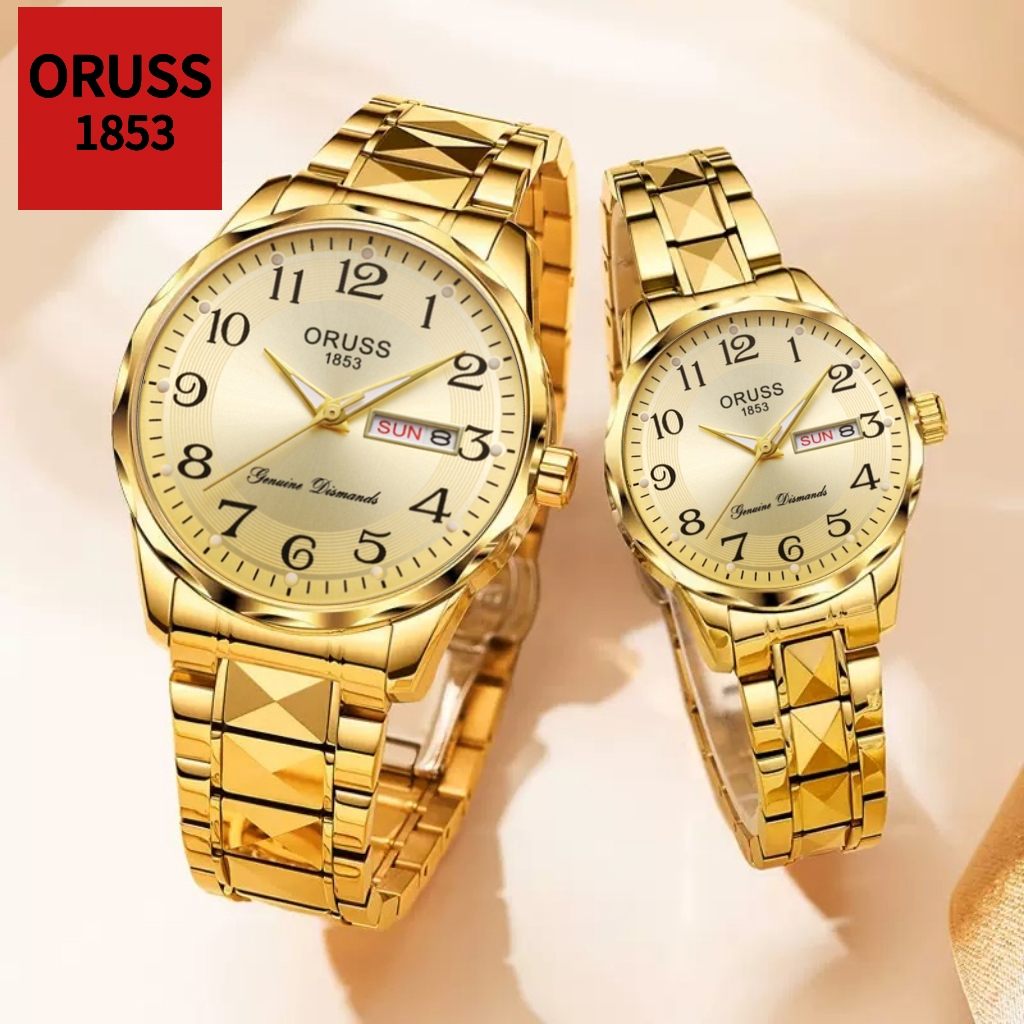 ORUSS รัส คู่เดิมหรูหราปฏิทินคู่กันน้ําเรืองแสงทองสแตนเลสนาฬิกาแฟชั่นเกาหลีรุ่นควอตซ์นาฬิกาข้อมือ