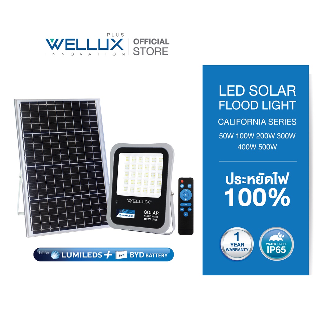 WELLUX โคมไฟฟลัดไลท์พลังงานแสงอาทิตย์ 50W 100W 200W 300W 400W 500W แสงขาว แสงวอร์ม LED Solar Floodlight