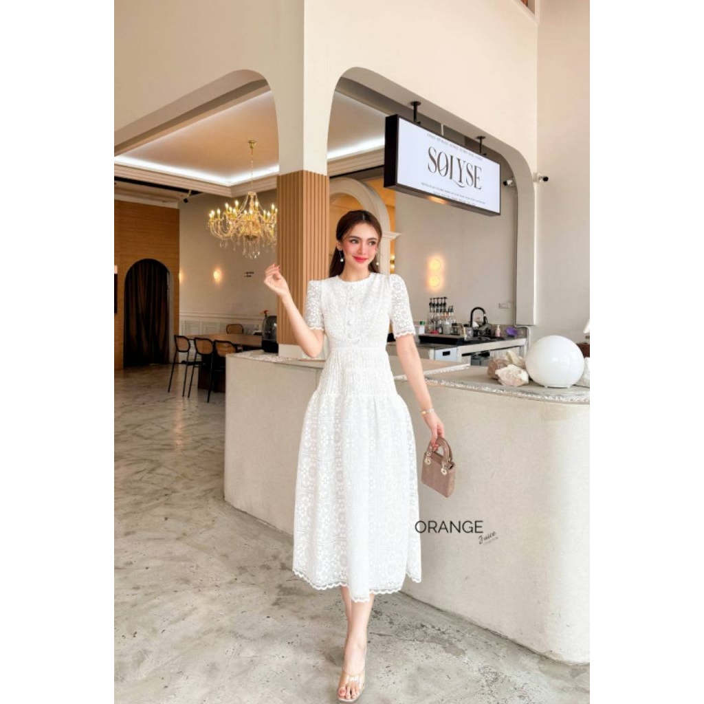 ครบไซซ์ S-5XL❗เดรสลูกไม้ขาวสวยสง่า Maxi Dress เดรสสาวอวบ,เดรสสีขาวผ้าลูุกไม้แขนสั้นแต่งกระดุมหน้า งานป้าย Orange Juice