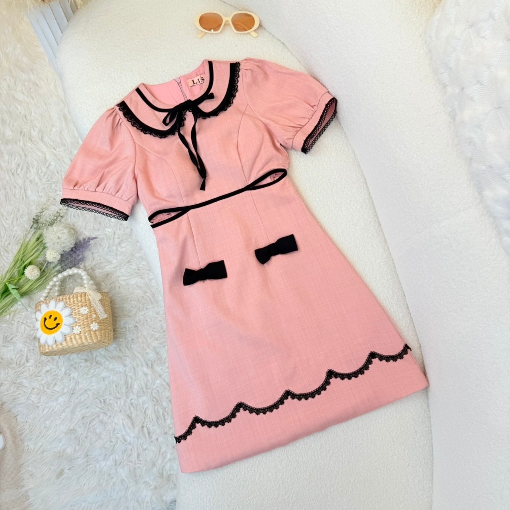 [LISA] A1142 ชุดเดรสกระโปรงคอบัวแต่งลููกไม้แขนตุ๊กตาเว้าเอวแต่งโบว์สวยละมุน ใส่เที่ยว ดินเนอร์ คาเฟ่