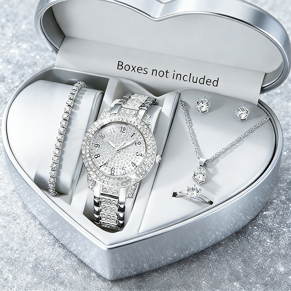 6ชิ้น ผู้หญิงแฟชั่น พลอยเทียม นาฬิกาควอตซ์สแตนเลสวงชุดเครื่องประดับอินเทรนด์เก๋อเนกประสงค์โดยไม่ต้องกล่อง