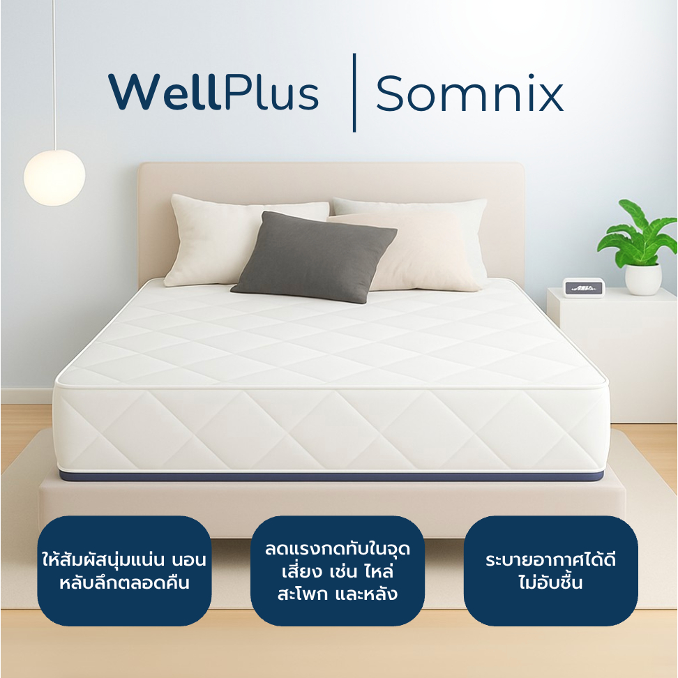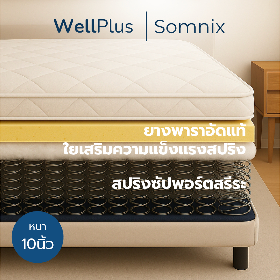 WellPlus ที่นอนยางพาราแท้เสริมสปริงพรีเมียม รุ่น Somnix หนา 10 นิ้ว โครงสร้างแข็งแรง นุ่มเด้งนอนสบาย รองรับน้ำหนักได้ดี