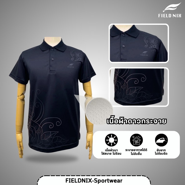 FIELDNIX เสื้อโปโลพิมพ์ลาย ลายดอกกุหลาบ สีดำ ผ้านุ่ม ใส่สบาย ไม่ต้องรีด