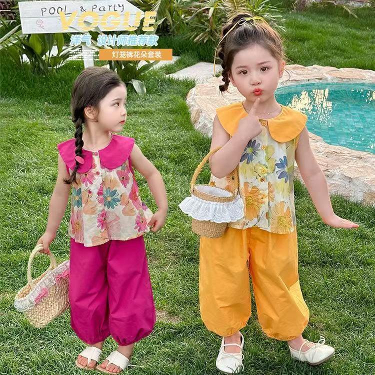 YL03 ชุดลายดอกไม้เด็กผู้หญิง เสื้อ+ กางเกงขาบานสีพื้น ชุดเซ็ต 2 ชิ้น น่ารักสดใส