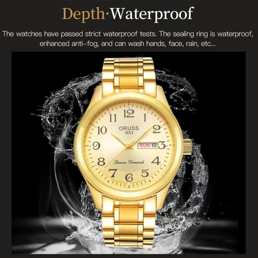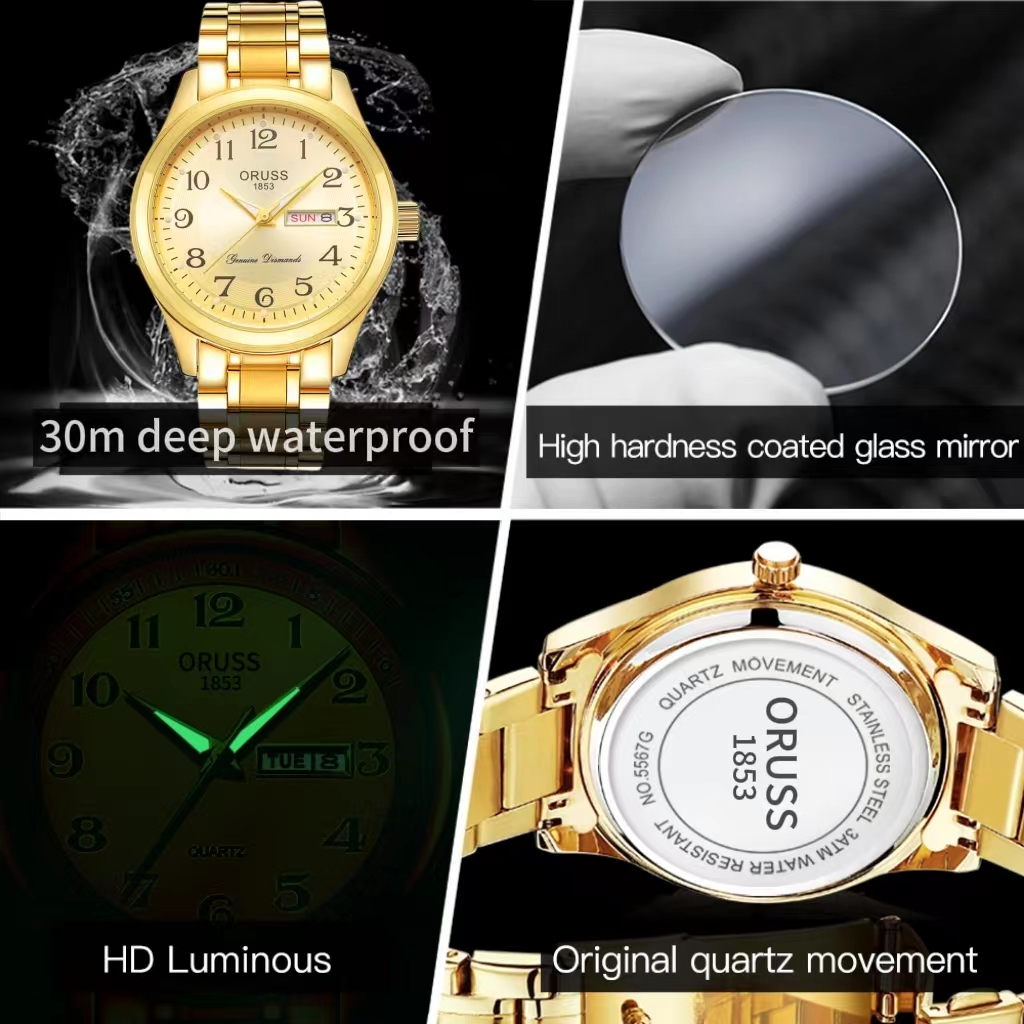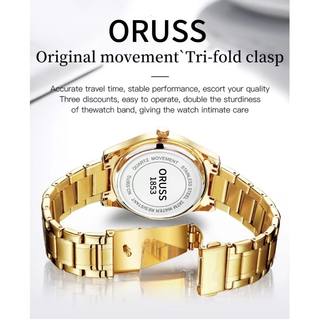 ORUSS Original Dual ปฏิทินสแตนเลสหรูหรากันน้ําทองแฟชั่นนาฬิกาผู้ชายธุรกิจ Luminous เวอร์ชั่นเกาหลี Silver Quartz นาฬิกา