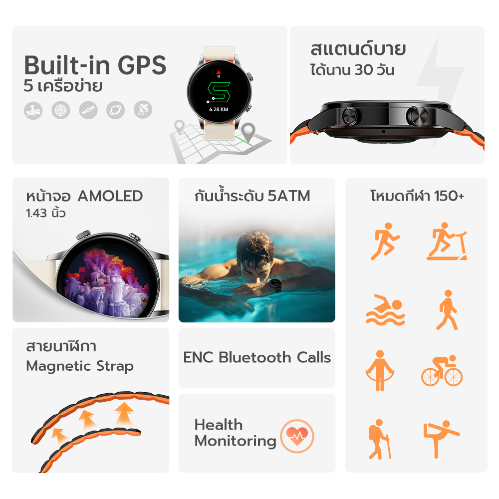 [ลดเหลือ 1592] Black Shark S3 Smartwatch สมาร์ทวอทช์ มี GPS รองรับ Bluetooth Calling จอใหญ่ 1.43 นิ้ว กันน้ำ 5ATM -1Y