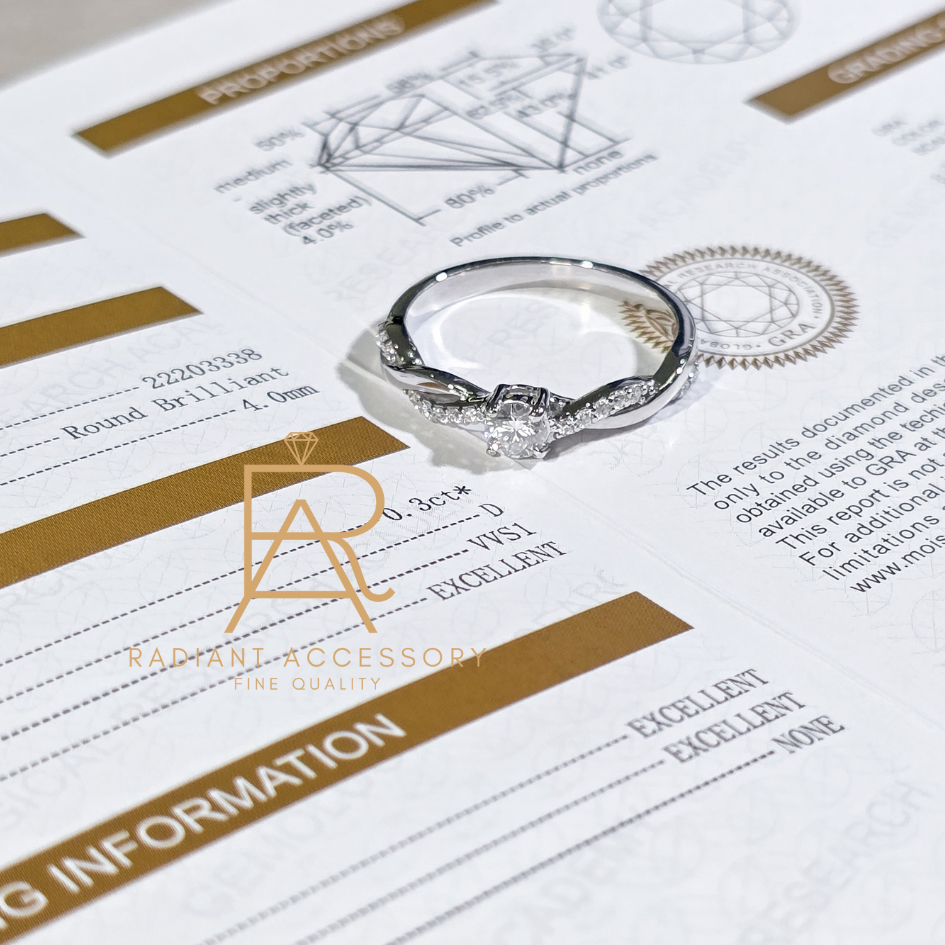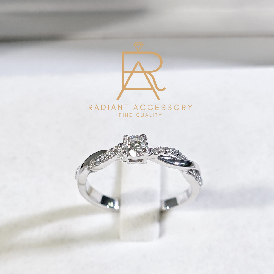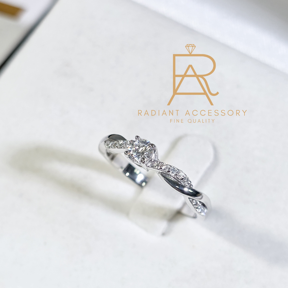 แหวนเงินแท้เม็ดชูฝังเพชร Moissanite 0.3 กะรัต ทรงกลม ก้านลายถักฝังบ่าข้าง ชุบทองคำขาว