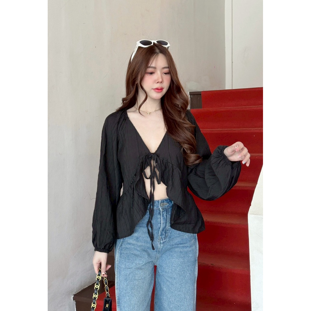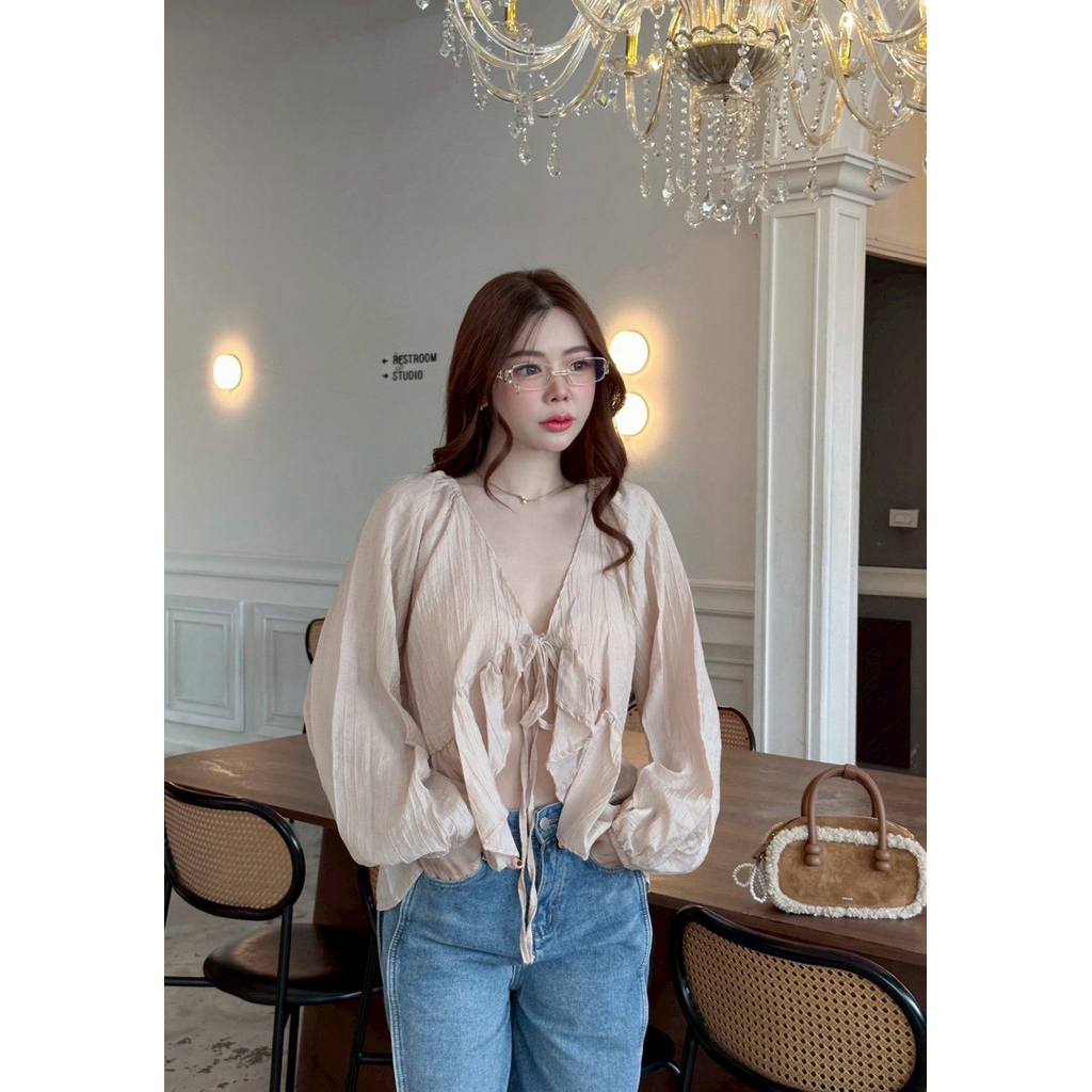 เสื้อซีทรูเเขนพองนิดๆ ผูกโบว์หน้า Sora Blouse ระบายรอบเอว ใส่เที่ยว
