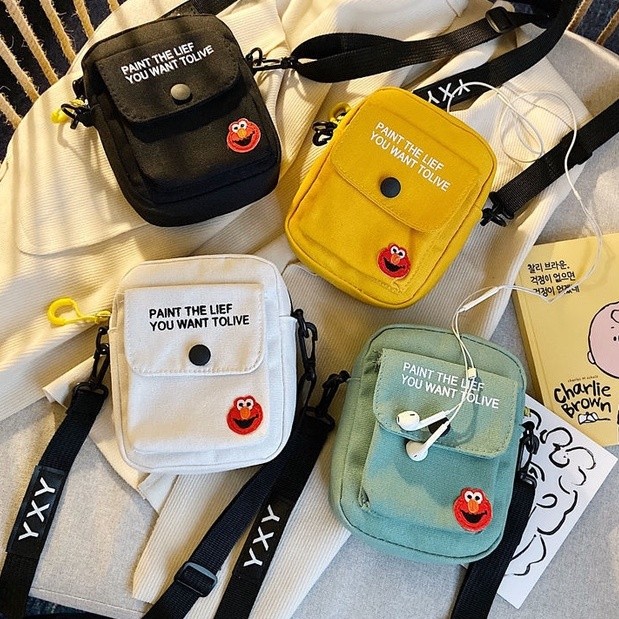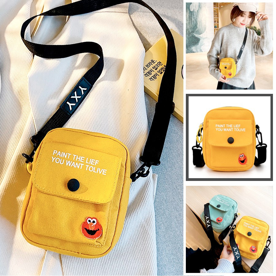 กระเป๋าสะพายไหล่แฟชั่น กระเป๋าคาดอกผ้าแคนวาสลายเอลโม่สุดเก๋ น่ารัก สายปรับได้ มีสีให้เลือกจาก BeautySS.th
