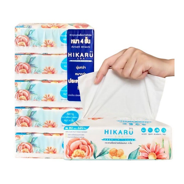 (ขายยกลัง 10 หิ้ว 50 ห่อ) HIKARU ฮิคารุทิชชู่พรีเมียมหนา 4 ชั้น ไร้ฝุ่น 1 แพ็คหิ้ว มี 5 ห่อ ปรับขนาดใหม่ ใหญ่กว่าเดิม