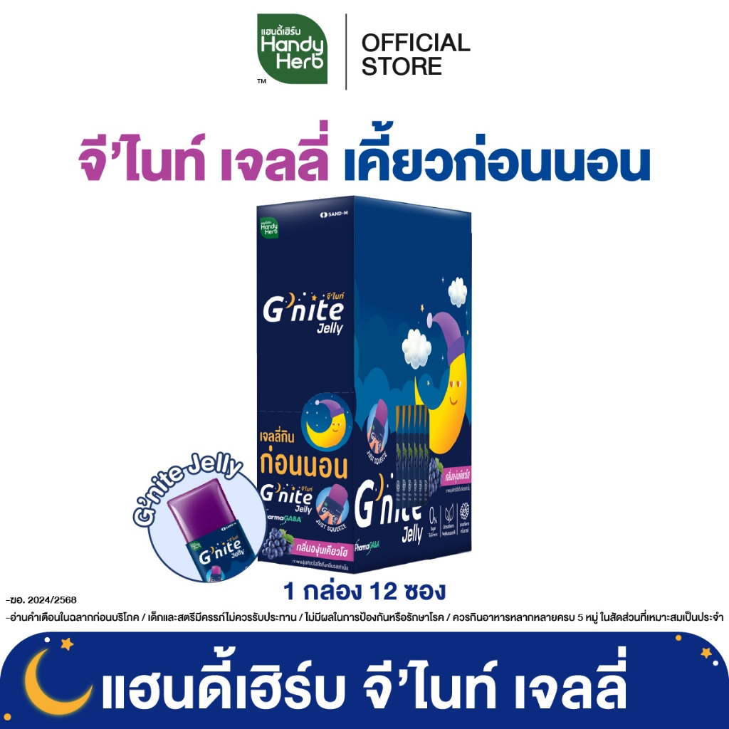 HandyHerb G'nite Jelly เเฮนดี้เฮิร์บ จี'ไนท์ เจลลี่ เคี้ยวก่อนนอน กลิ่นองุ่นเคียวโฮ 1 กล่อง (12 ซอง)