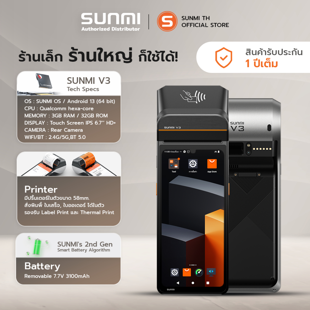 SUNMI V3 เร็วกว่าเดิม พร้อมโปรแกรมPOS เดลิเวอรี Android 13 พิมพ์ใบเสร็จในตัว