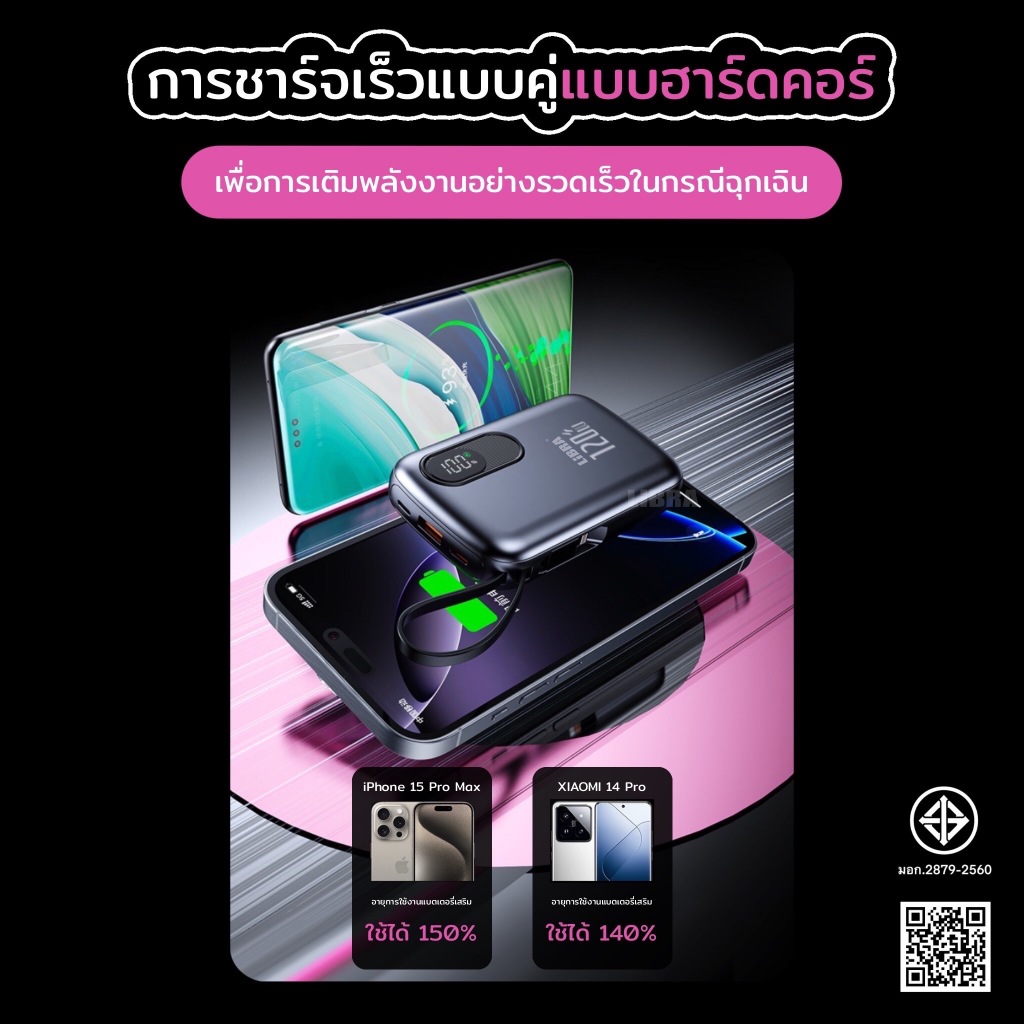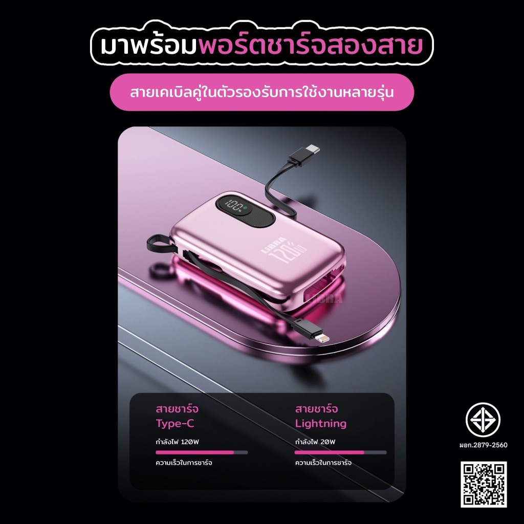 LiBRA Q70 พาวเวอร์แบงค์ รองรับการชาร์จเร็ว120W สายชาร์จในตัว พร้อมจอแสดงLED และสายคล้องแบบพกพา