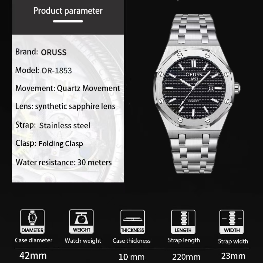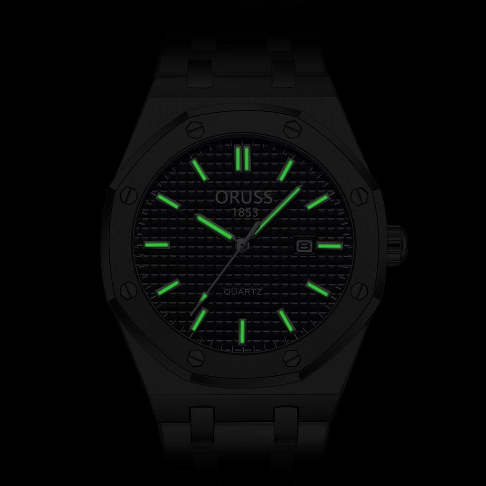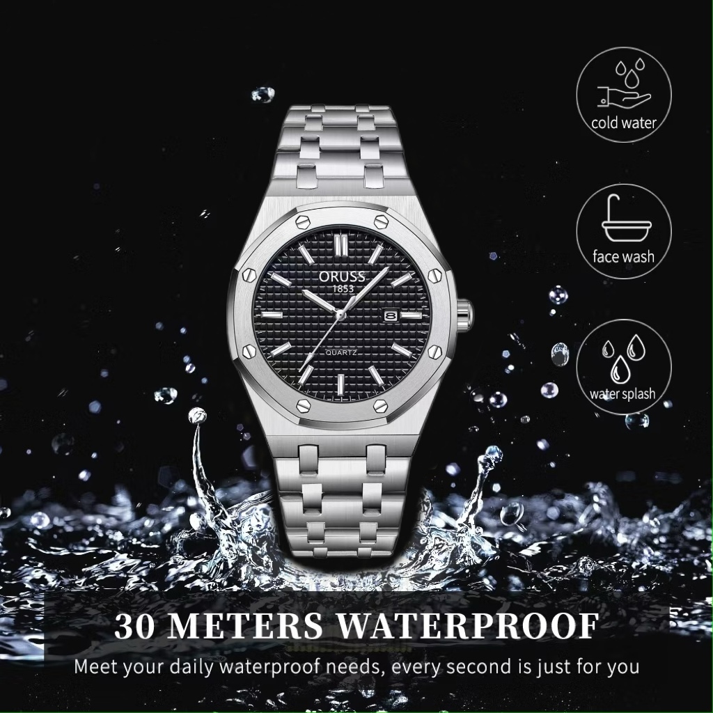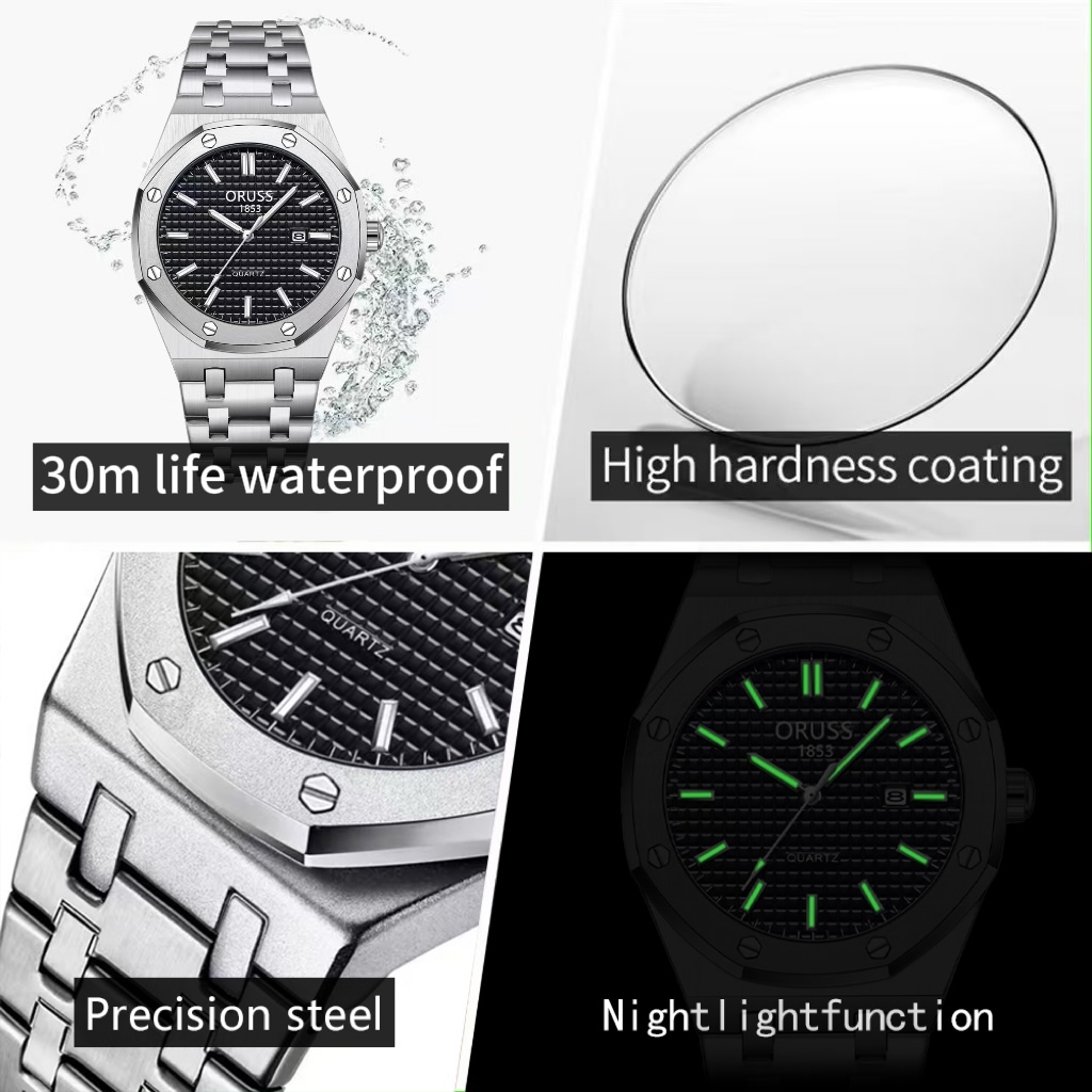 ORUSS รัส ต้นฉบับ ผู้ชายสแตนเลสหรูหราส่องสว่างกันน้ําปฏิทินคู่นาฬิกาเงินแฟชั่นเกาหลีรุ่นควอตซ์นาฬิกาข้อมือ