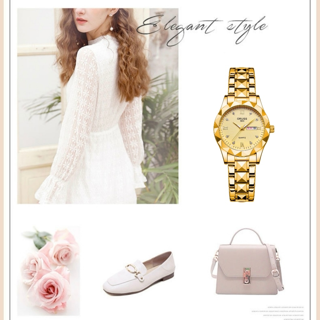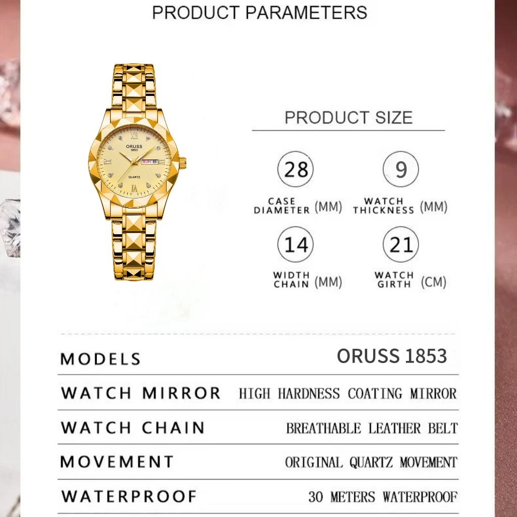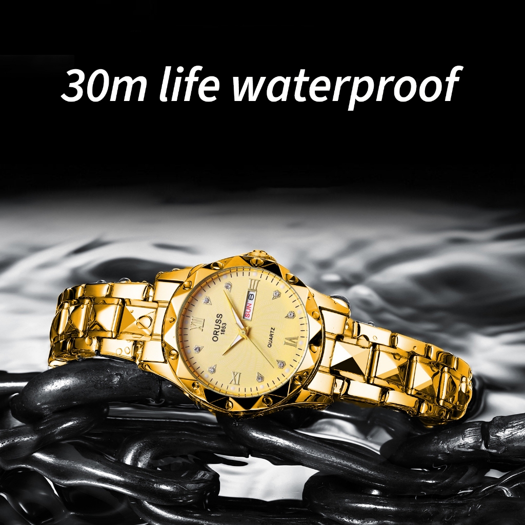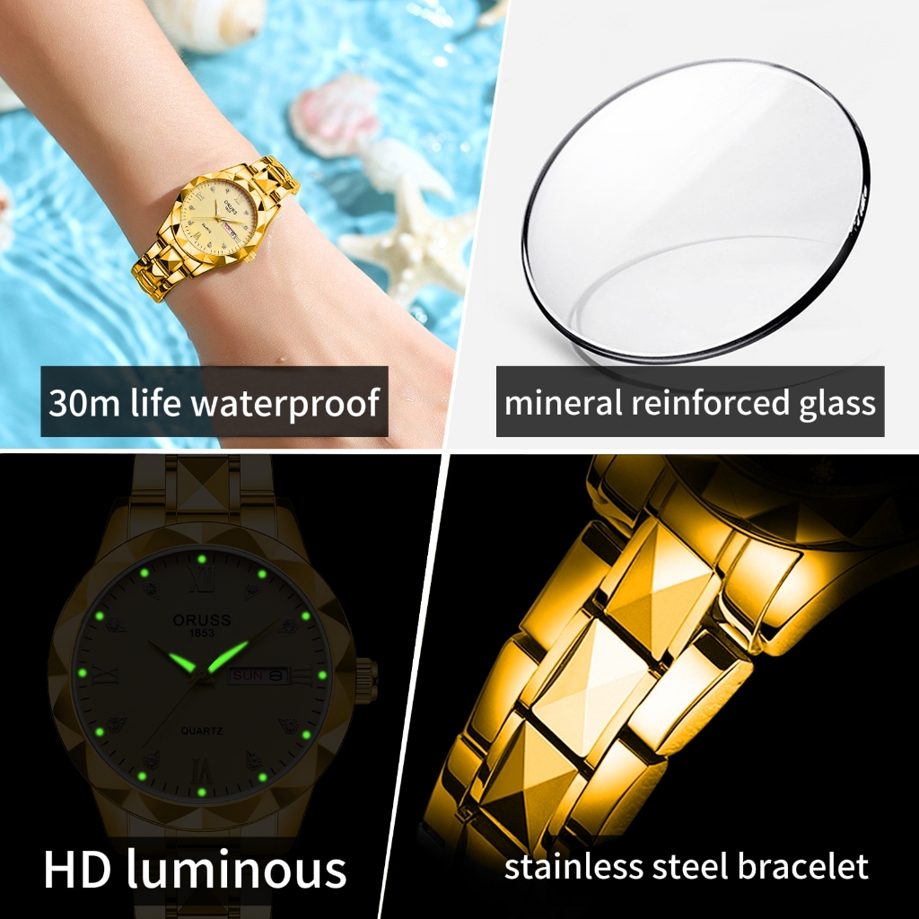 ORUSS Original หญิงหรูหรากันน้ํา Luminous Dual ปฏิทินทองสแตนเลสนาฬิกาขนาดเล็กแฟชั่นเกาหลีรุ่นนาฬิกาข้อมือควอตซ์