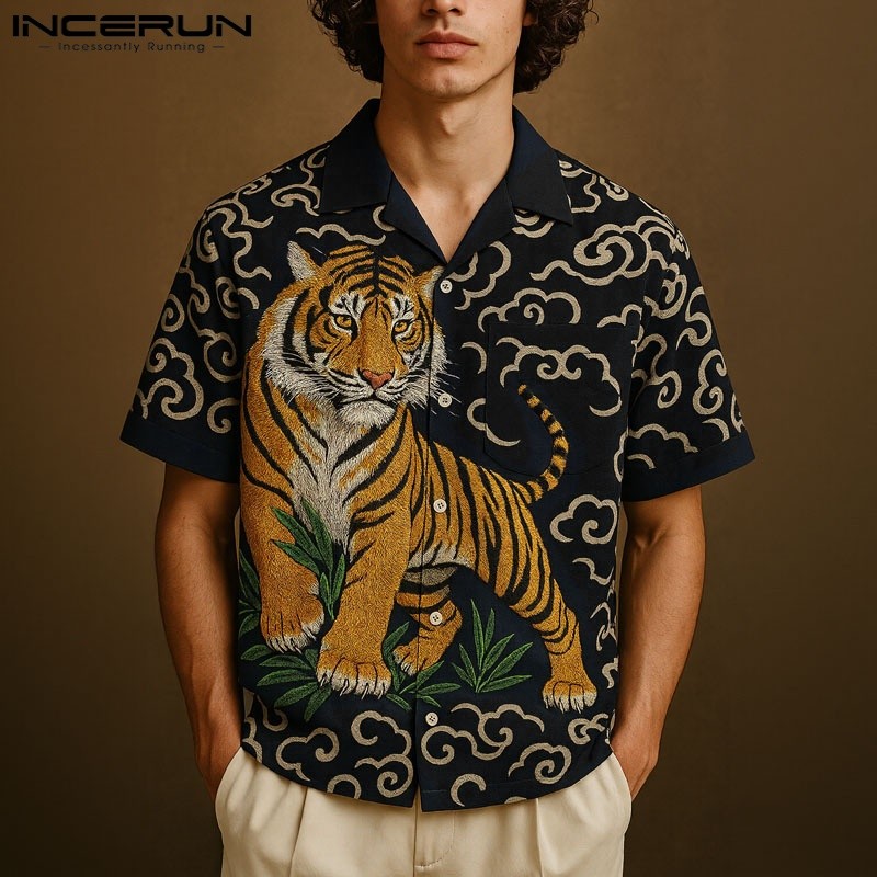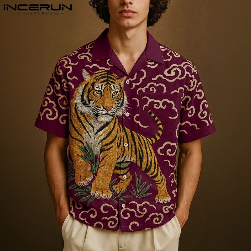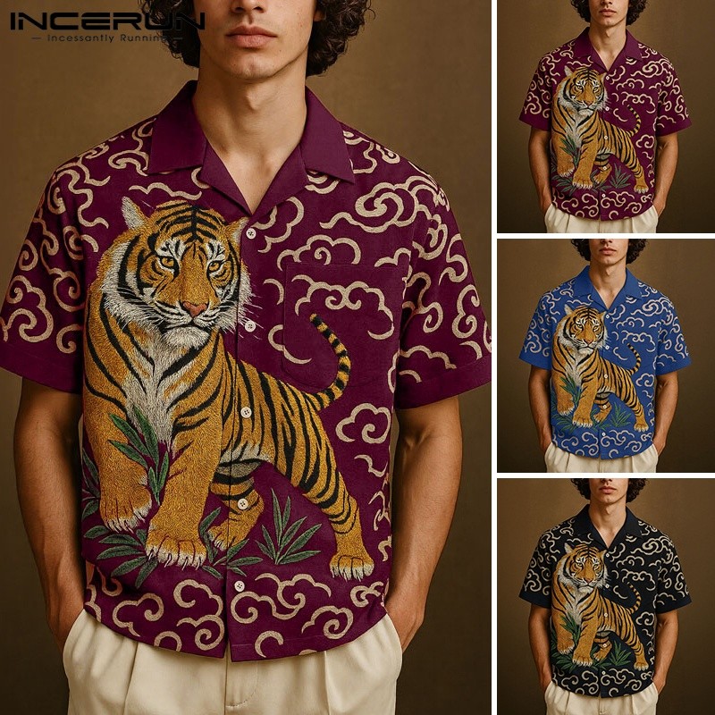 INCERUN ผู้ชายวินเทจอินเทรนด์ปก Raglan แขนเสือพิมพ์ปุ่มขึ้นเสื้อ