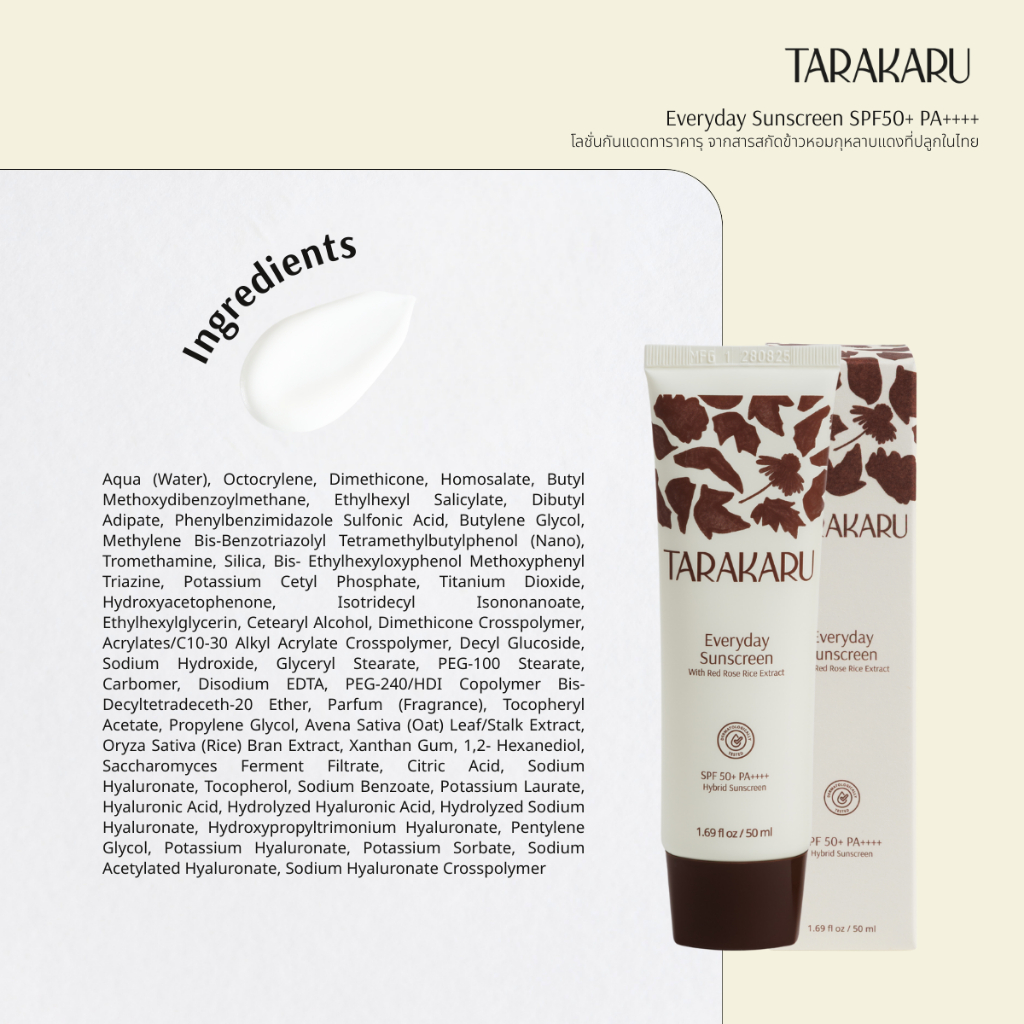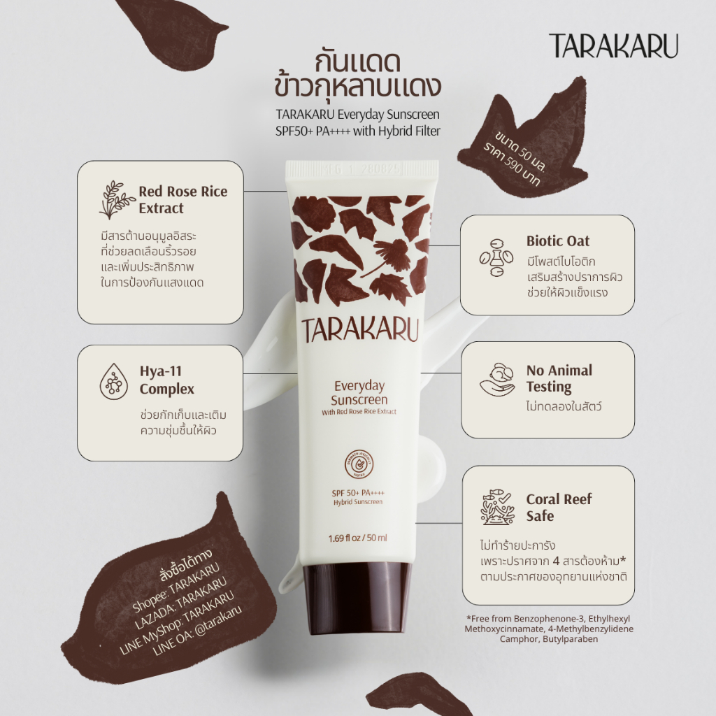 TARAKARU Everyday Sunscreen SPF50+ PA++++ 50ml กันแดดทาราคารุ เนื้อโลชั่น บางเบา ไม่เหนอะหนะ คุมมัน