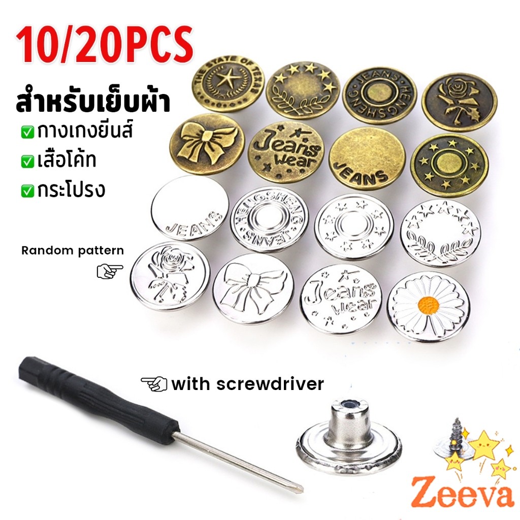 Zeeva กระดุมขยายเอวกางเกงยีนส์ กระดุมโลหะ ถอดได้ ใช้ซ้ําได้ พร้อมไขควง พร้อมกล่อง 10 ชิ้น/20 ชิ้น Jeans buttons