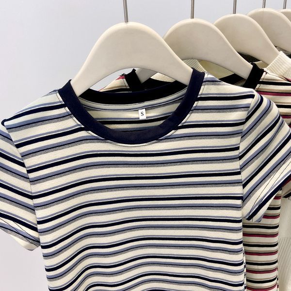 Y6Y - เสื้อยืดแขนสั้นลายทางสไตล์เกาหลี เสื้อครอปเข้ารูปคุณภาพสูงสำหรับผู้หญิง