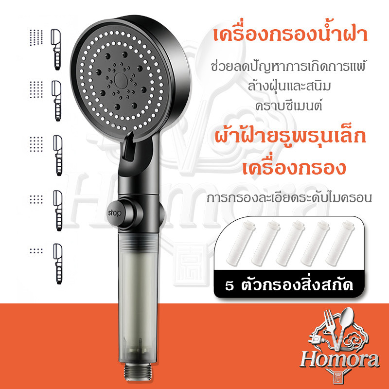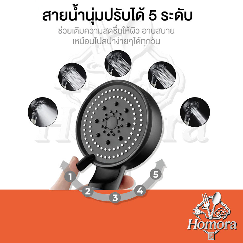 หัวฉีดฝักบัวตัวกรองในตัว, หัวฉีดมือถือ, โหมดน้ําปรับความเร็วได้ 5 ระดับ, สเปรย์อาบน้ํานวด, พร้อมฟังก์ชั่นปืนฉีด