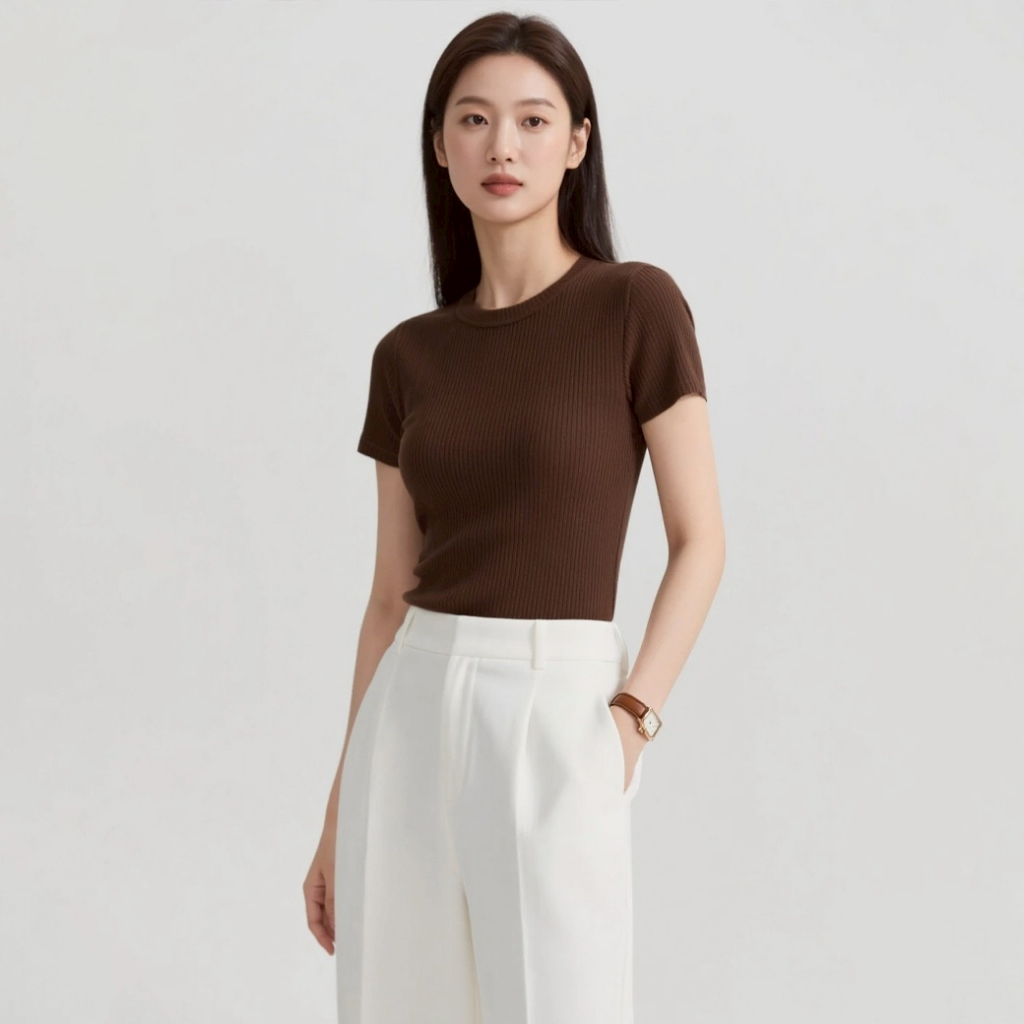 haas เสื้อยืดผู้หญิง คอกลม แขนสั้น ผ้าRip (ผ้าร่อง) สีพื้น รหัส HBTK2361