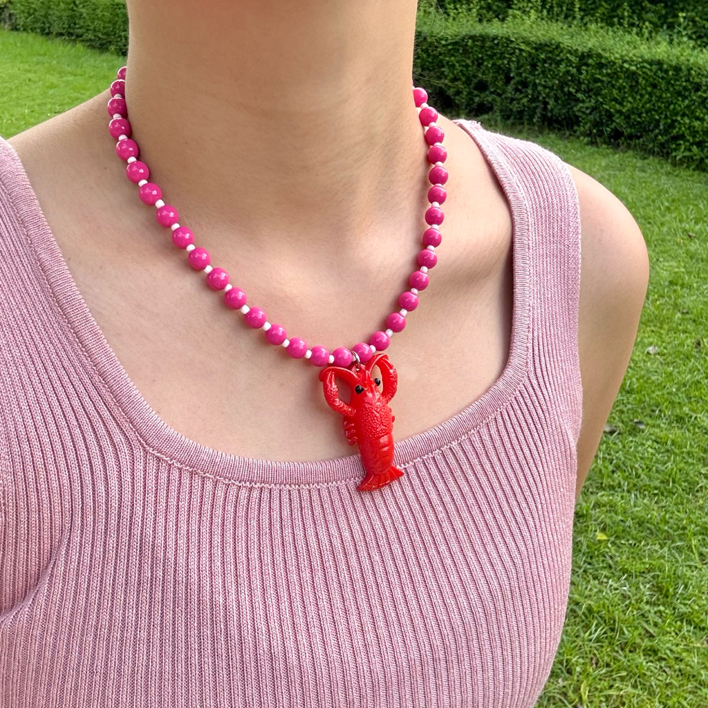 Piing me Necklace | สร้อยคอลูกปัดกลมสีบานเย็น (8 mm) สลับลูกปัดเม็ดเล็กพร้อมจี้ล็อบสเตอร์